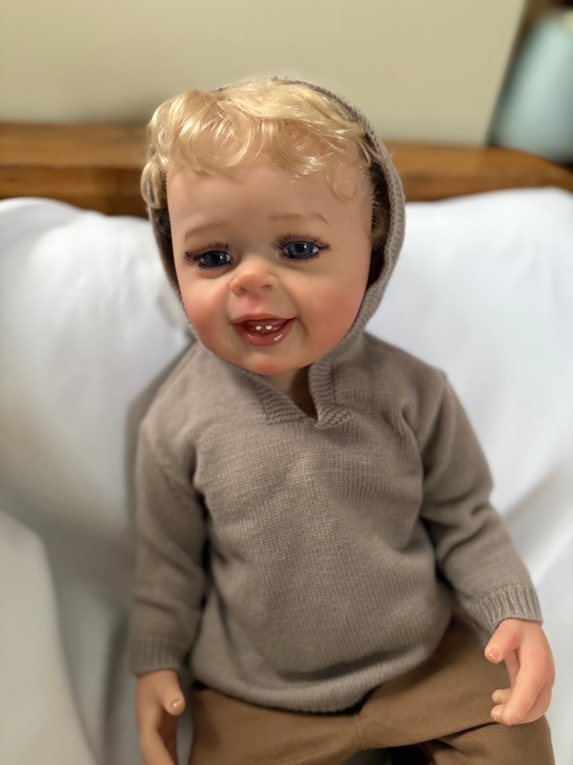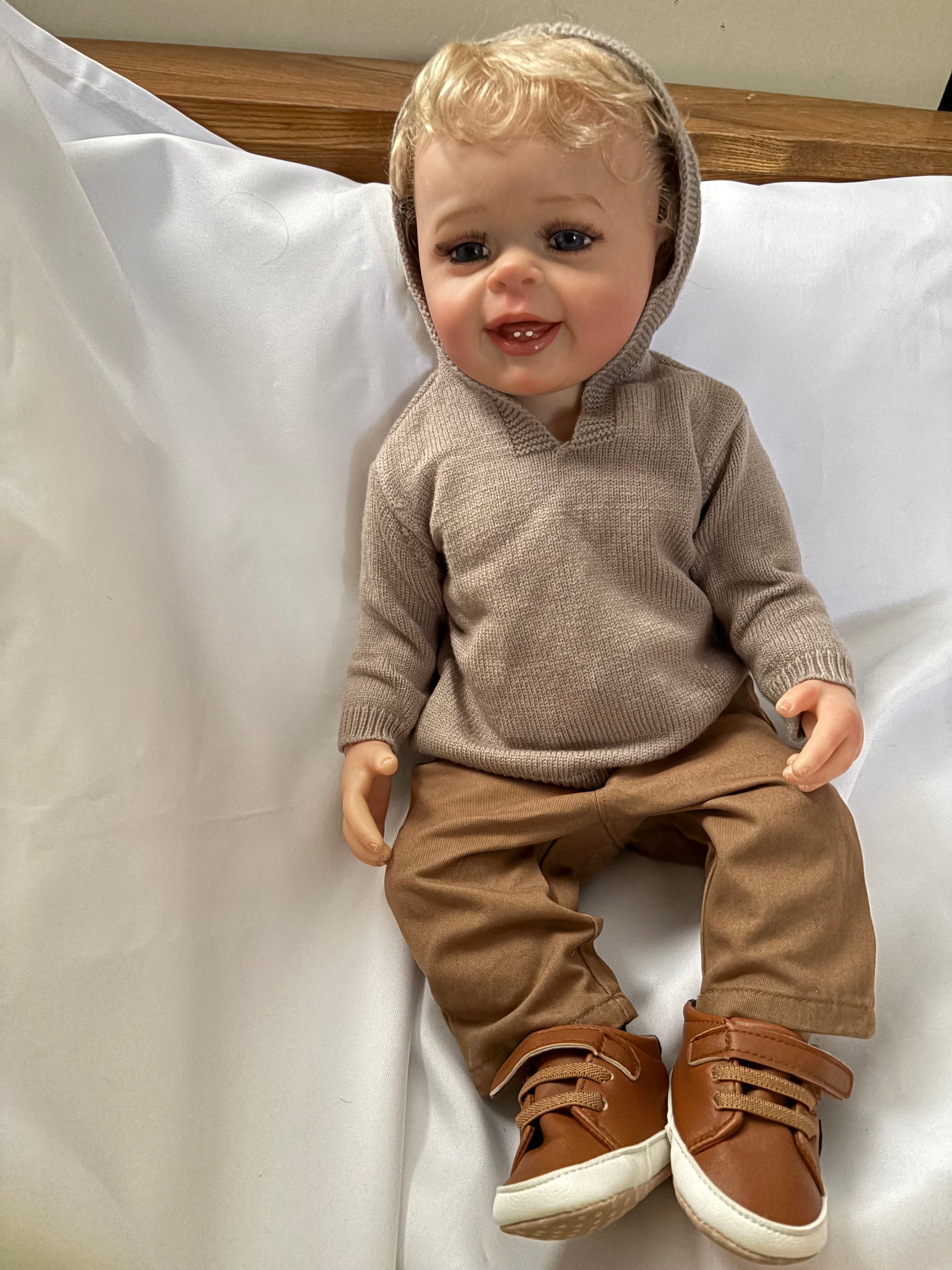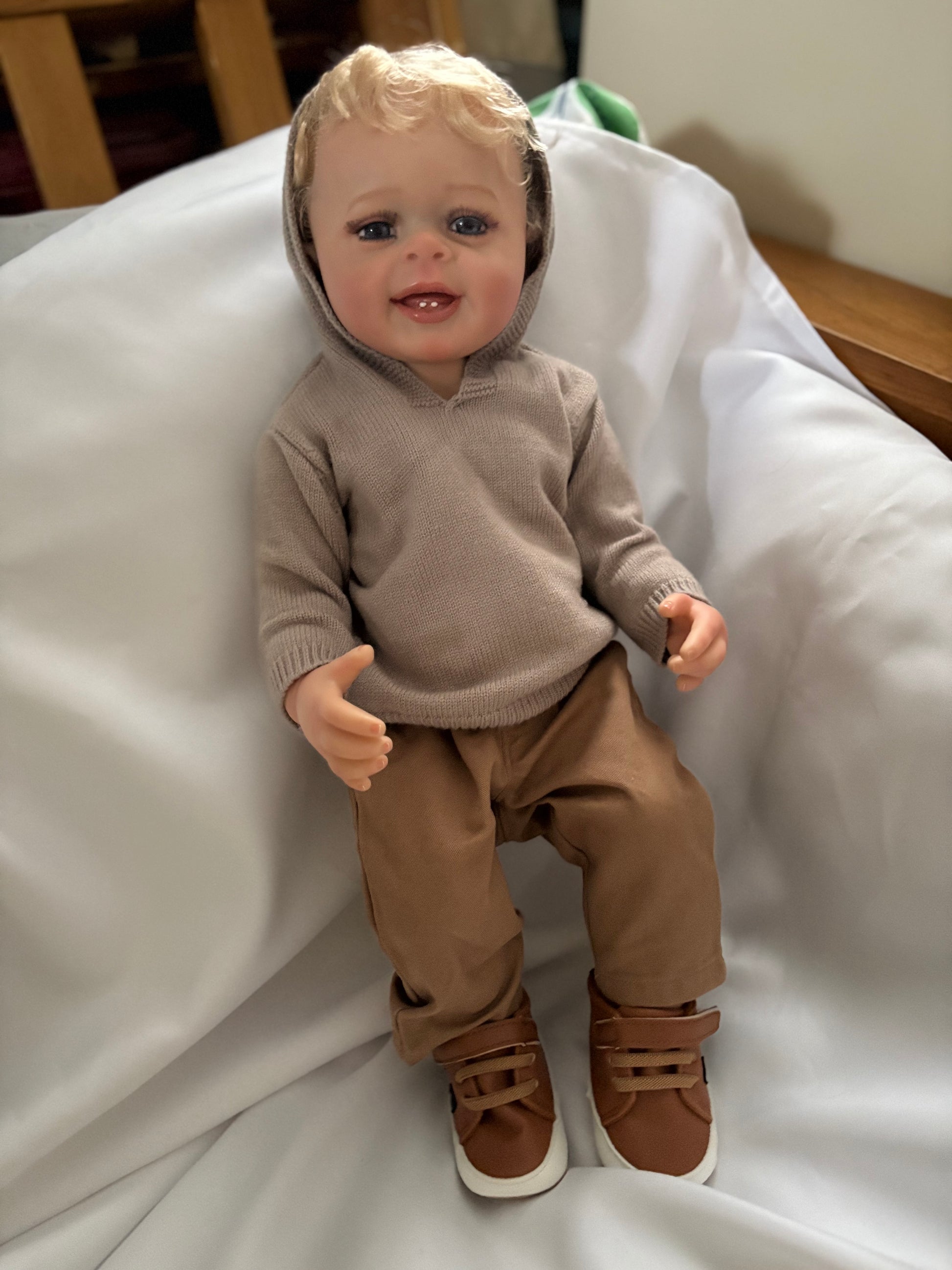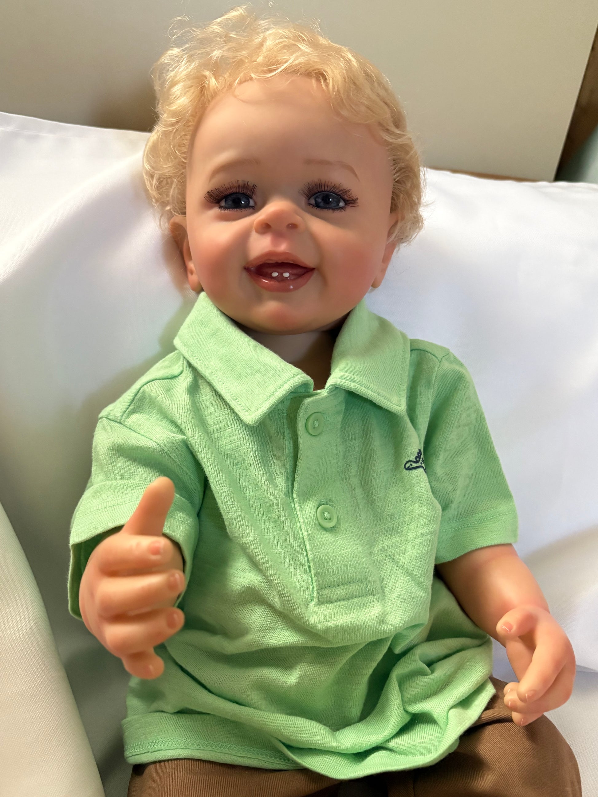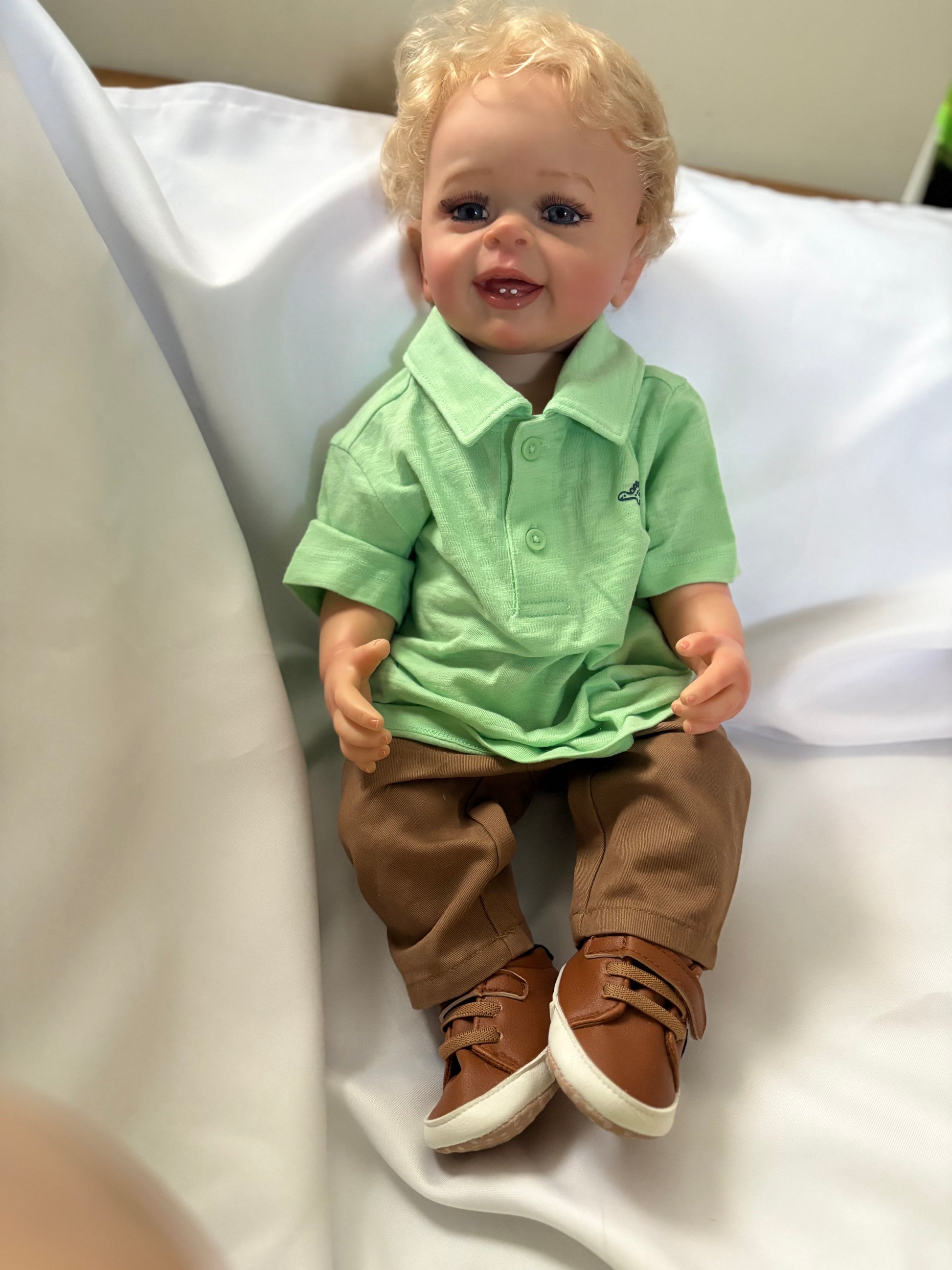This Adorable Reborn Boy Doll is lifelike and has realistic details including teeth, blonde rooted hair, translucent nails, visible veins, hand painted skin, and soft vinyl limbs. This doll is flexible and allows free movement of the head and limbs. Anatomically correct.