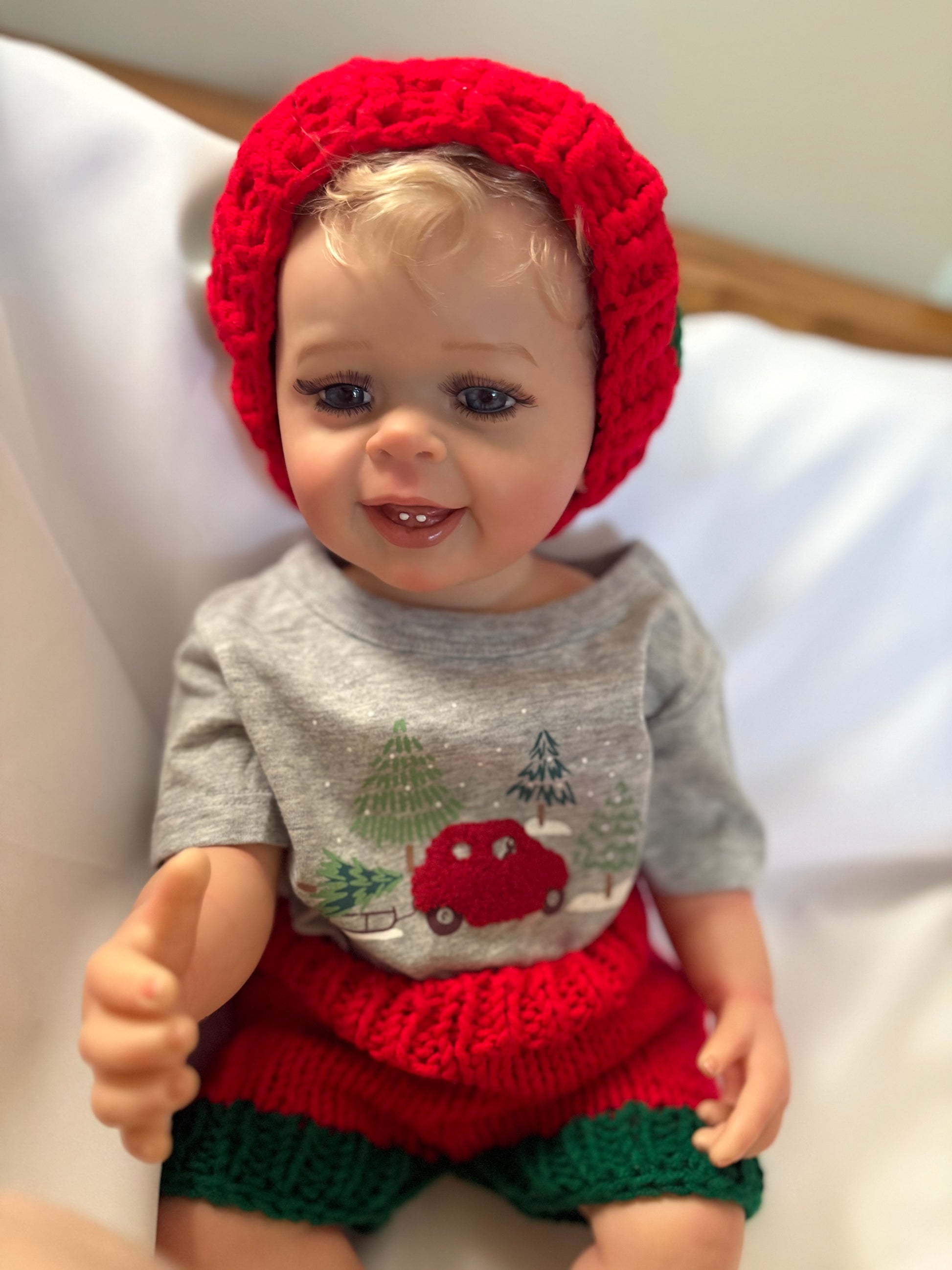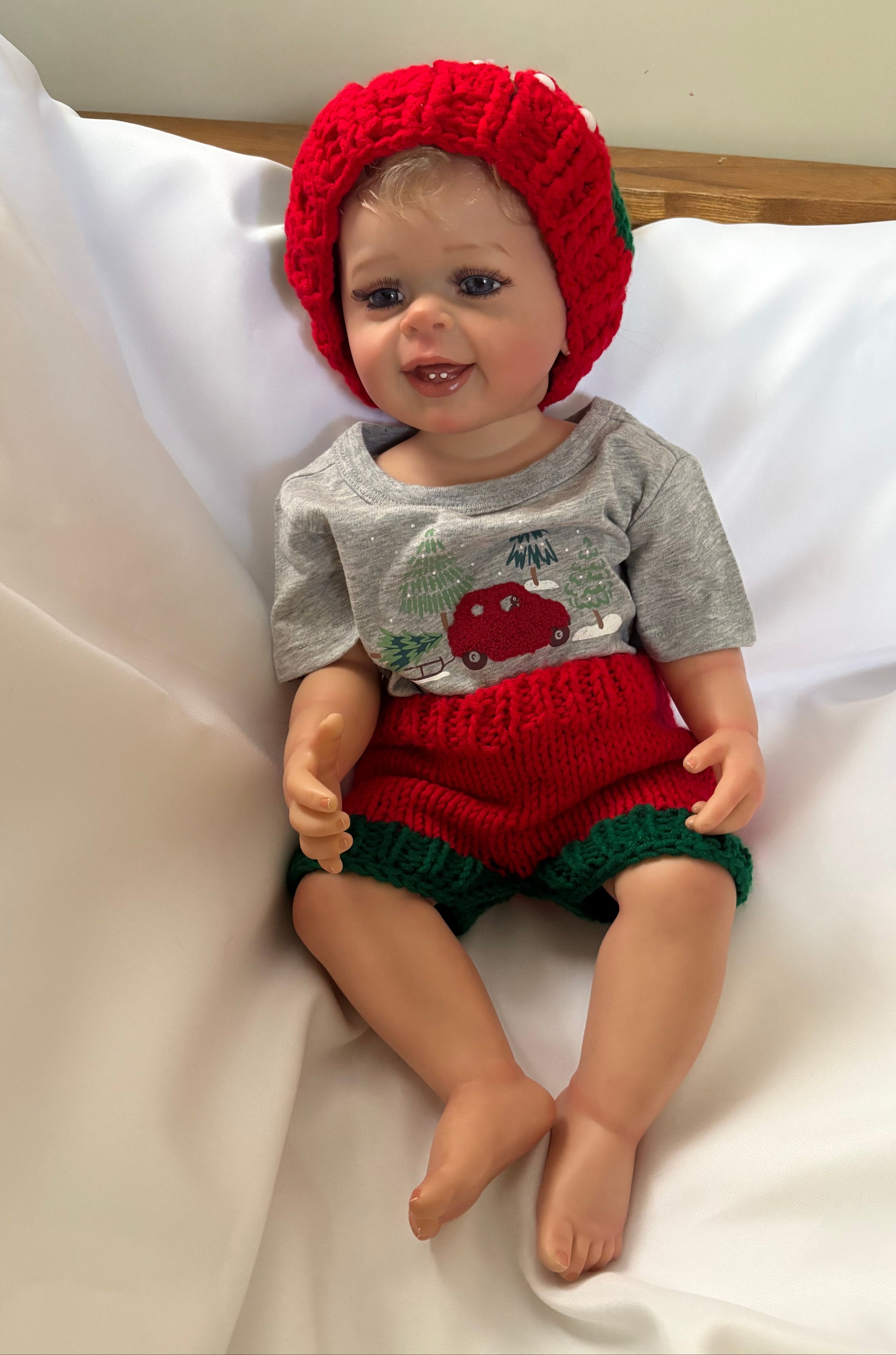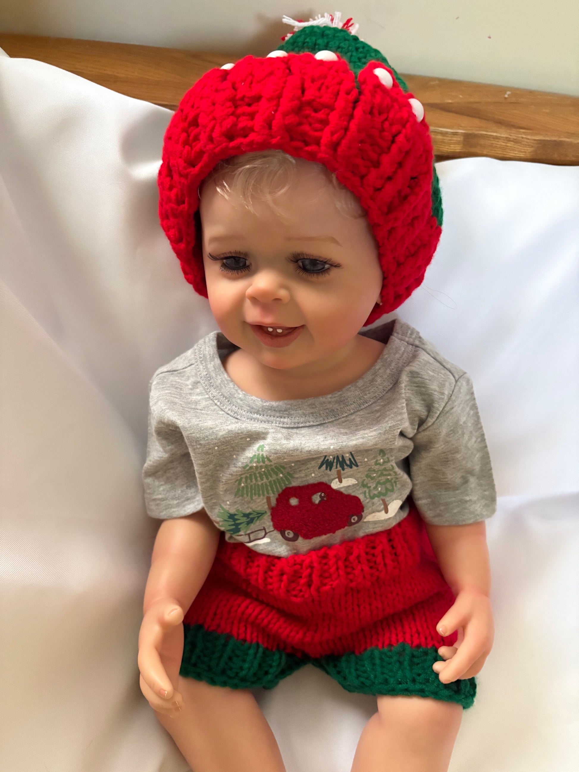 Also a Christmas outfit with matching red and green knit hat and shorts and an adorable grey t-shirt with a red Christmas car with tree in snow scene.