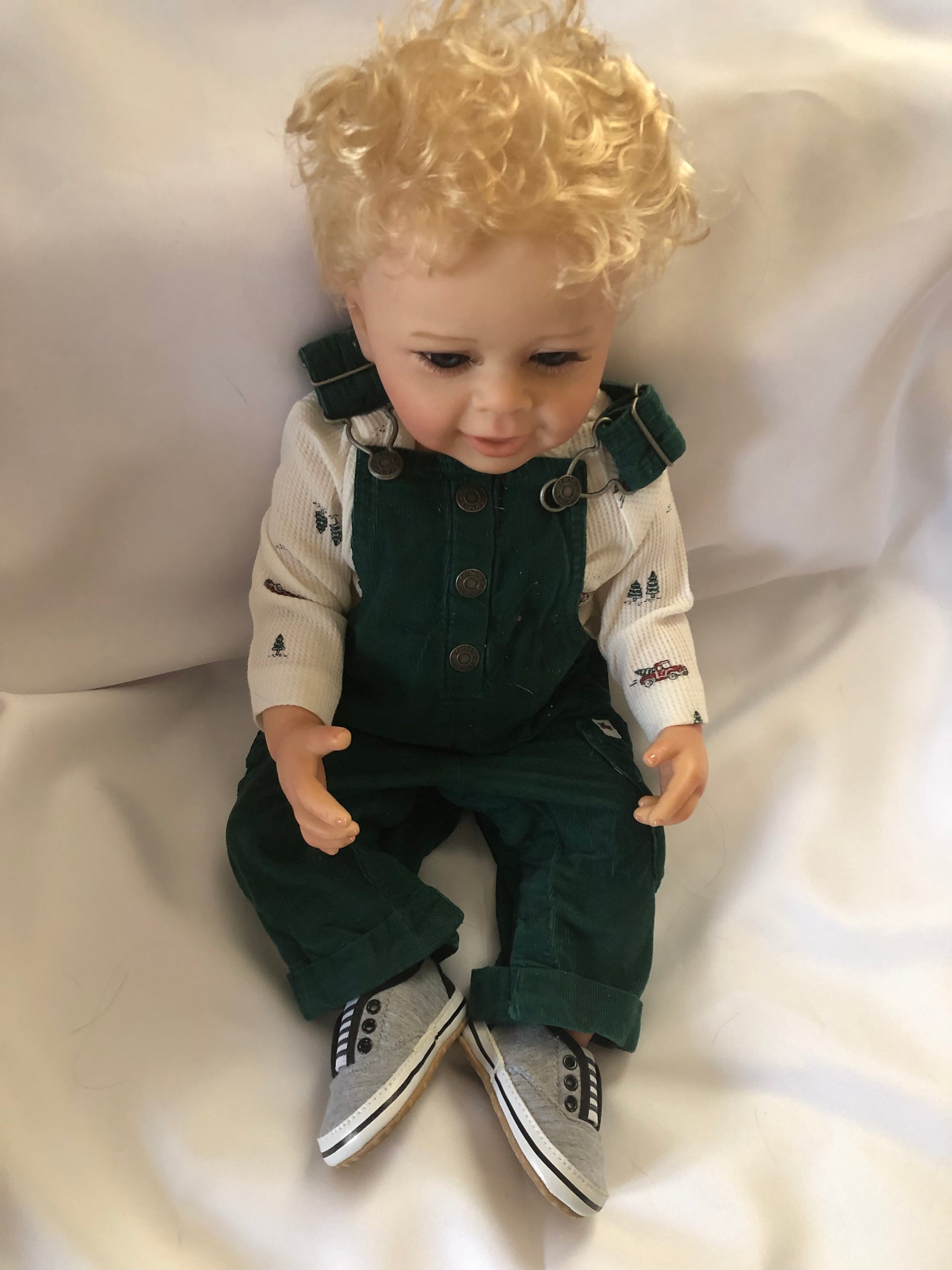 This Adorable Reborn Boy Doll is lifelike and has realistic details including teeth, blonde rooted hair, translucent nails, visible veins, hand painted skin, and soft vinyl limbs. This doll is flexible and allows free movement of the head and limbs. Anatomically correct.