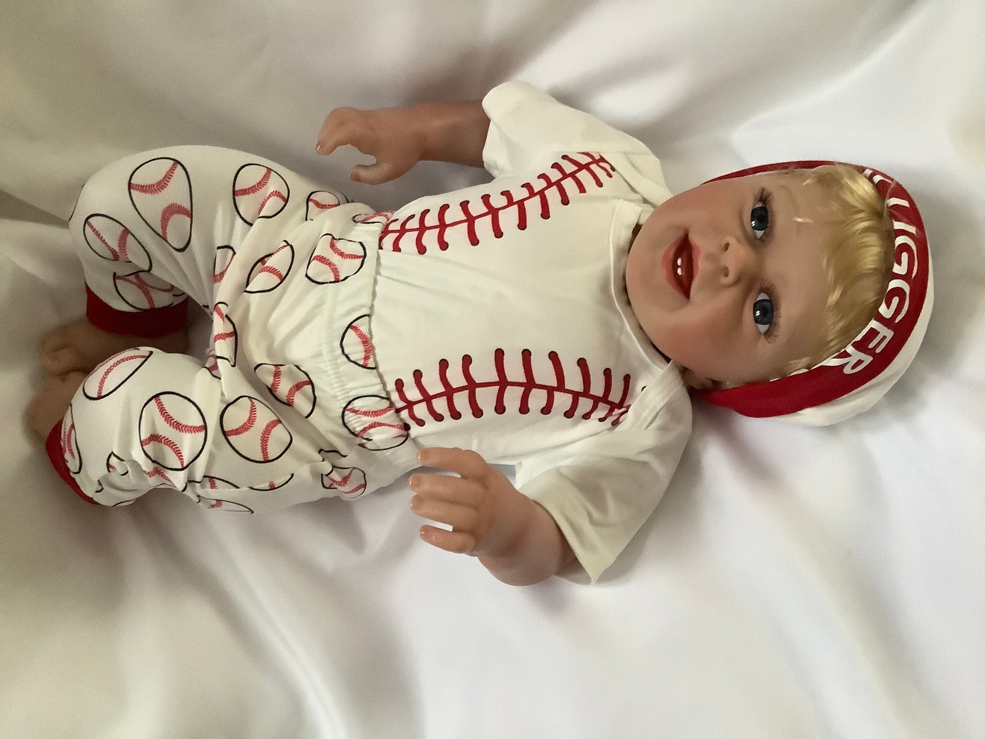 Athletic blonde boy comes with three outfits: baseball player outfit, knitted jogging outfit, and striped t-shirt and shorts with a baby bottle.