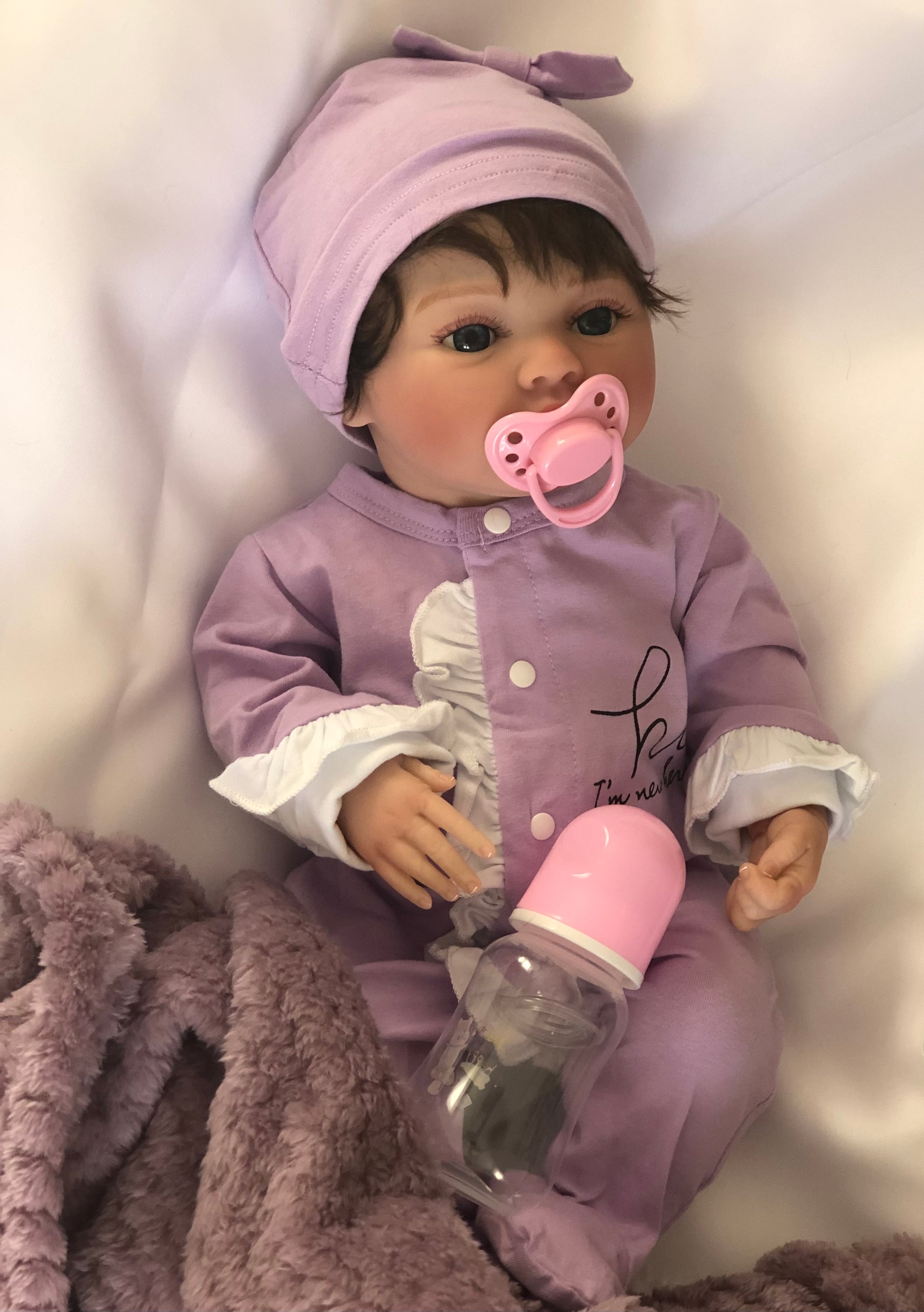 This Adorable Reborn Girl Doll is a lifelike newborn and has realistic details including brown brunette rooted hair, translucent nails, visible veins, hand painted skin, and soft vinyl limbs and viny body. This doll is flexible and allows free movement of the head and limbs.