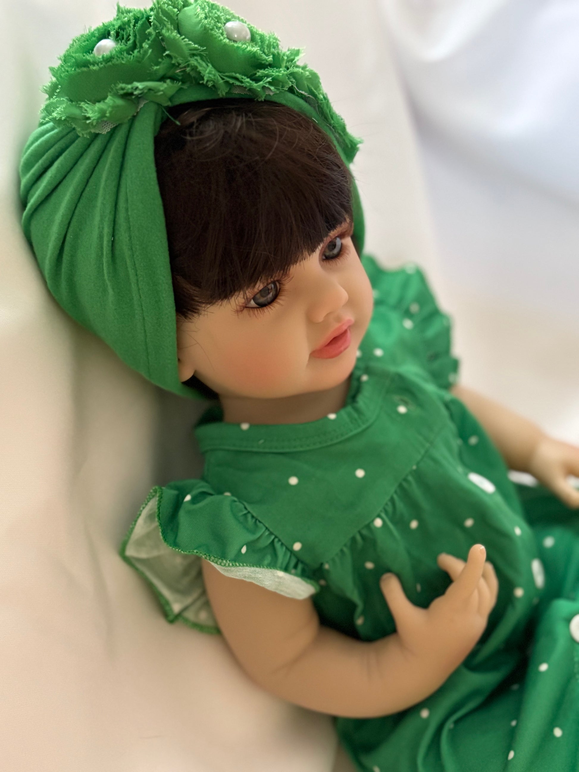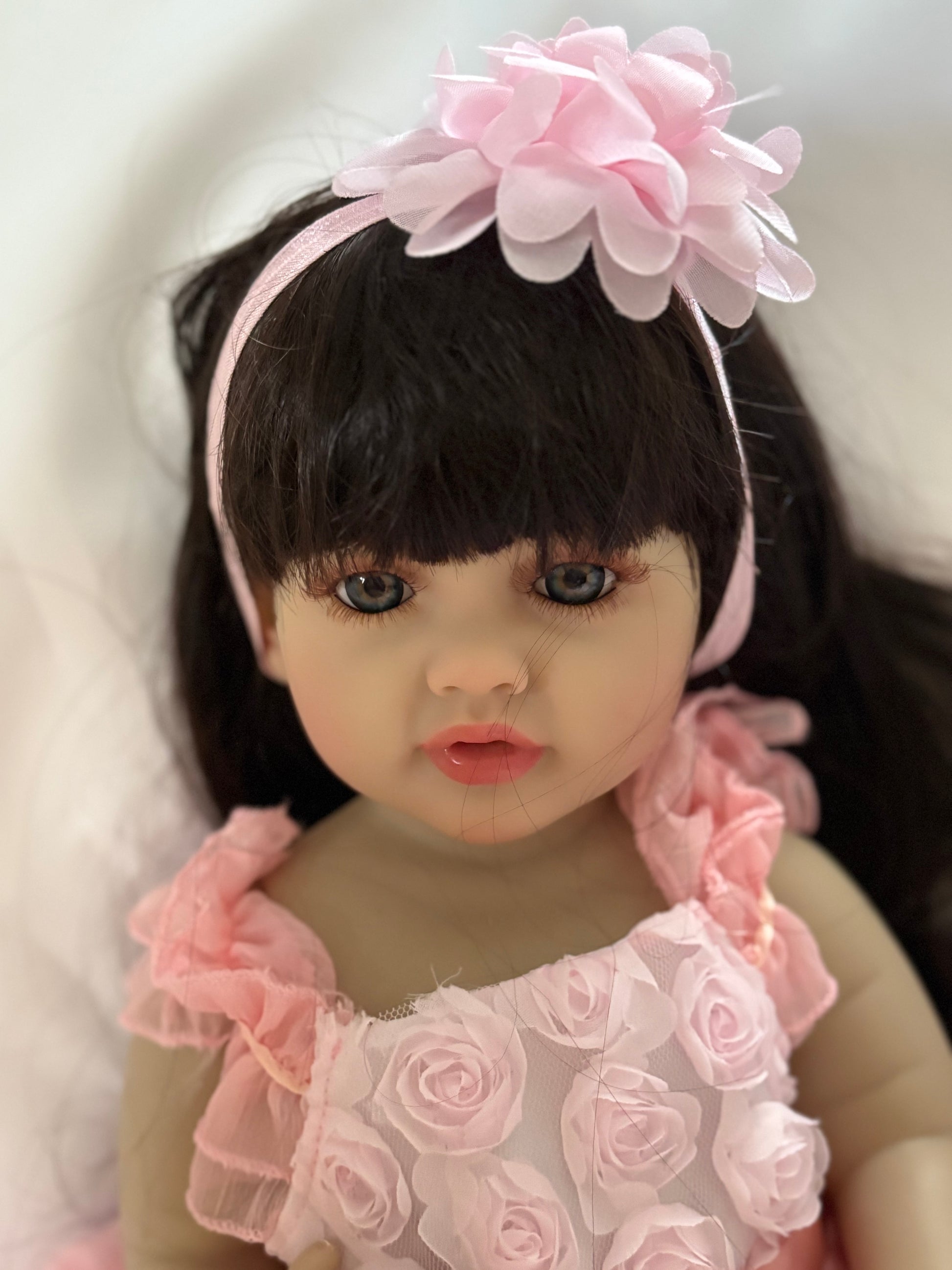 This Adorable Reborn Girl Doll is lifelike and has realistic details including rooted brown brunette hair, translucent nails, visible veins, hand painted skin, and soft vinyl limbs and body. This doll is flexible and allows free movement of the head and limbs with mobile joints. Anatomically correct.