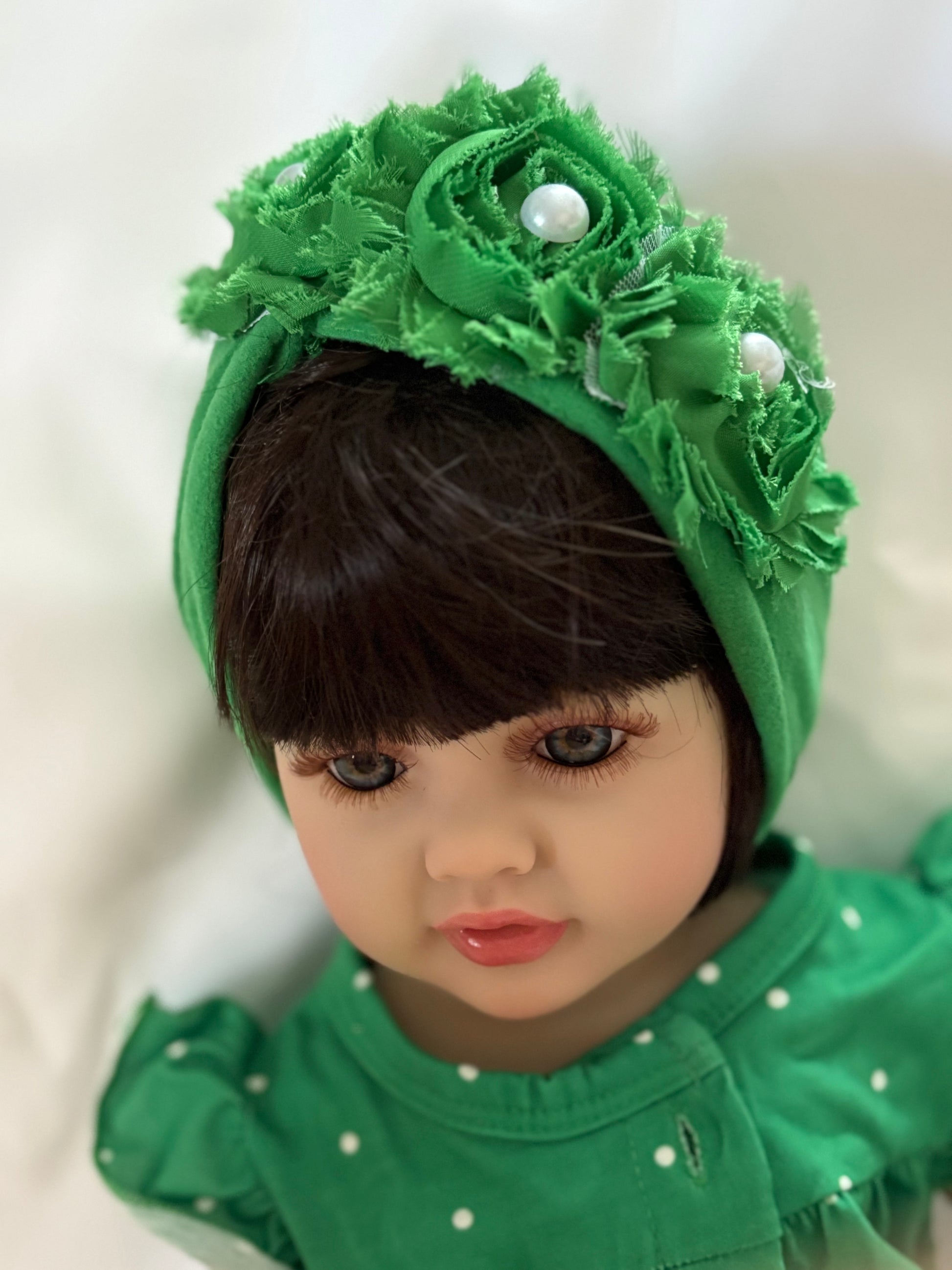 Includes two outfits: pink with matching headband and green with matching hat.