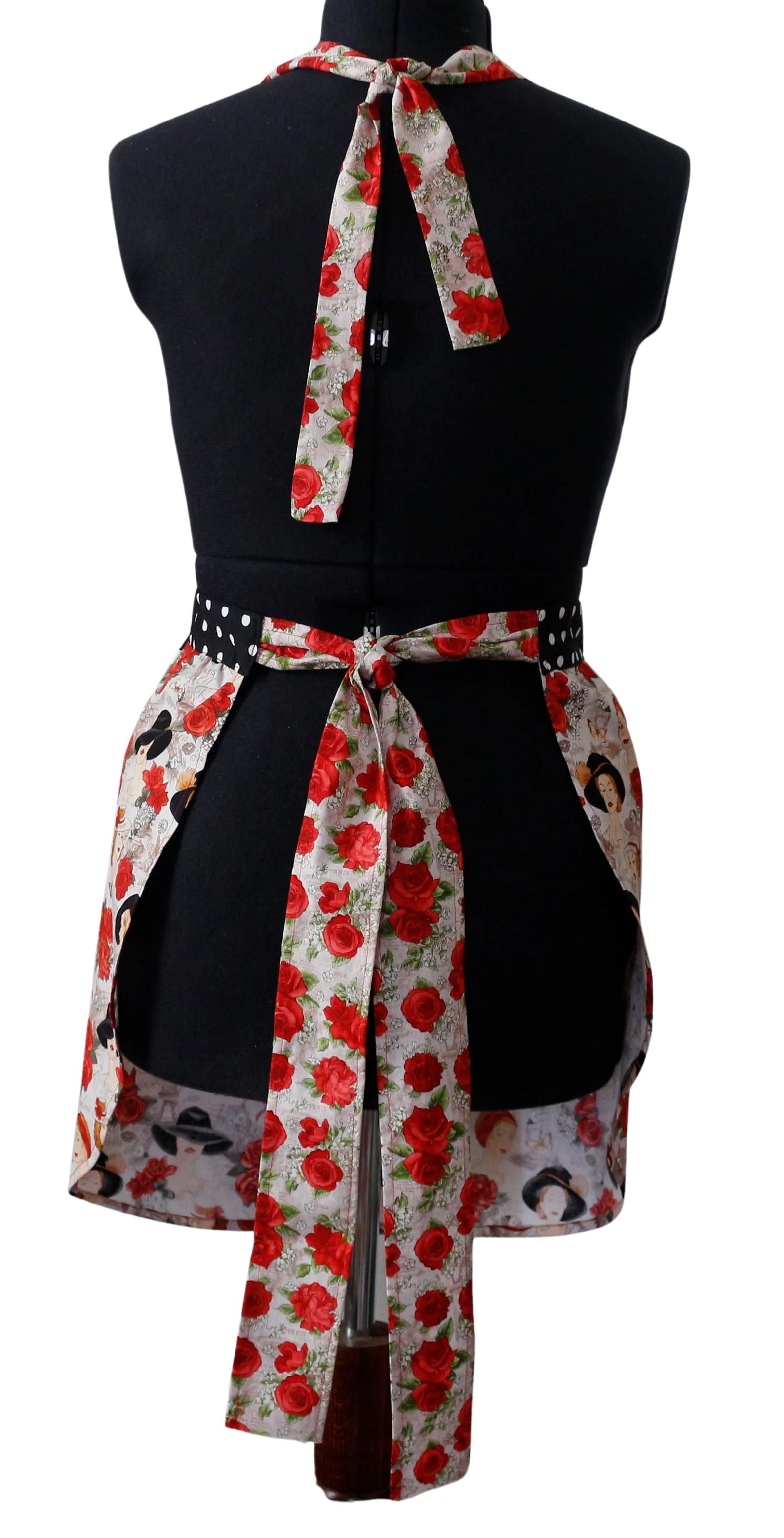 The apron has women in fashionable hats and bright red roses on a delicate light dusty rose pink background with light brown Parisienne images and French words in print. The waistband and top ruffles are white polka dots on black adding playful elegance. The long neck and waist ties have red roses on light dusty rose pink. The top of he apron is lined.
