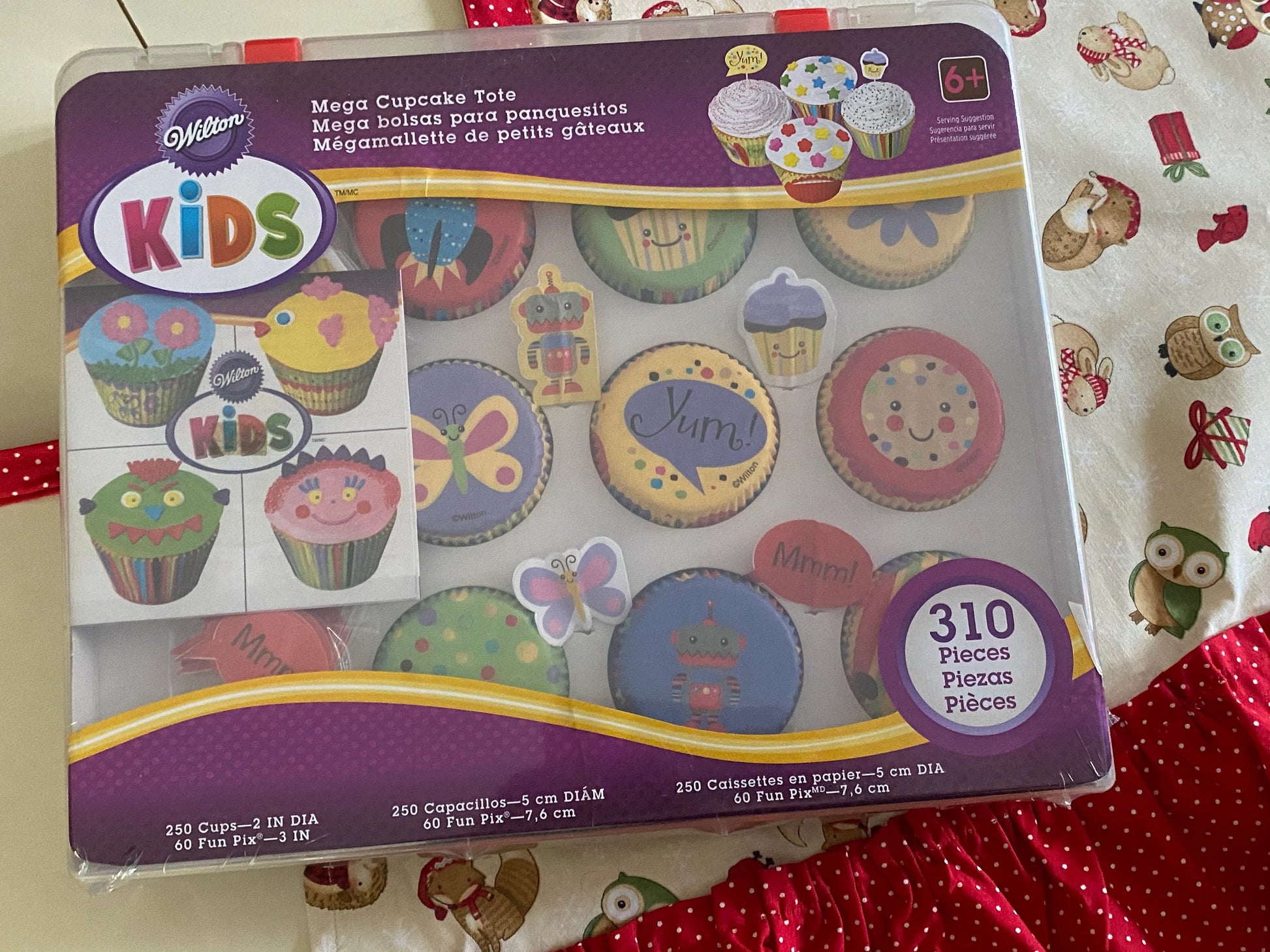 The baking set has 250 cupcake cups 2” diameter and 60 Fun Pix 3” for decoration.