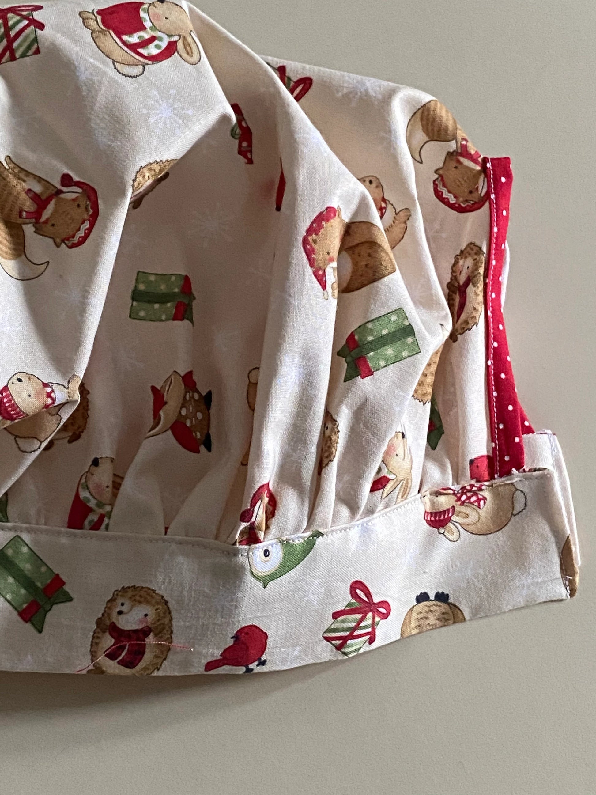 This Christmas Winter Woodland Animal apron and chef hat has tossed Christmas attired woodland animals owls, rabbits, hedgehogs, foxes, and cardinals along with holiday presents on a light beige background. The neck, waist ties, ruffles, and underarm trim are a bright cheerful red with delicate tiny white polka dots adding charm to this apron. The Chef hat has velcro to adjust to the child's head.