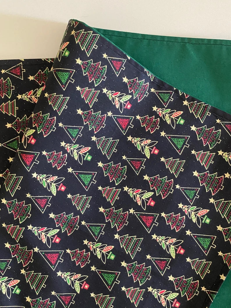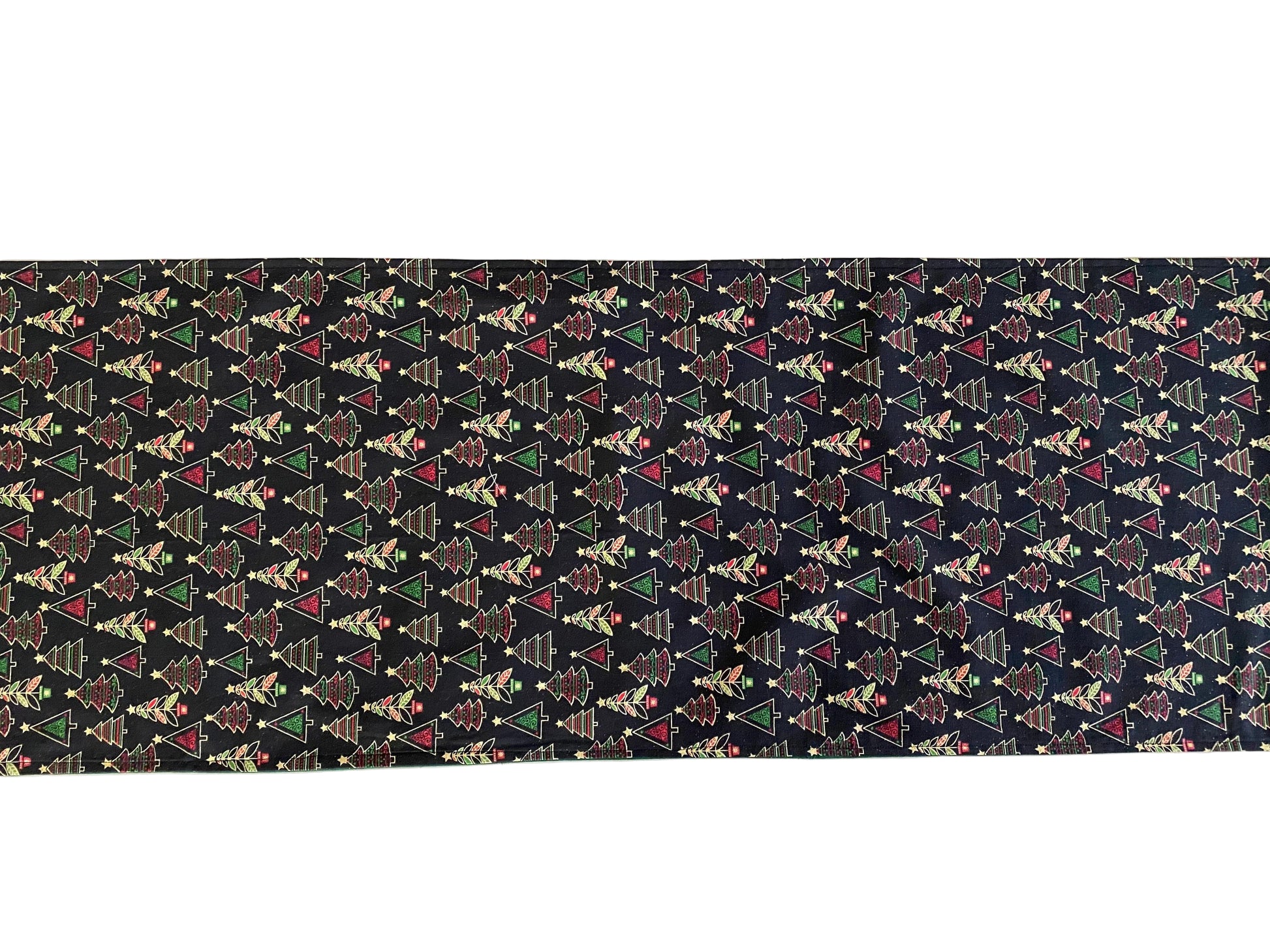 This table runner is black with a festive sparkling gold Christmas tree pattern. The tiny Christmas trees have red and green accents. The back of the runner is green cotton.
