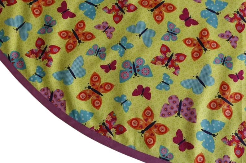 The handmade floral skirt is size 6 with an elastic waist band. This skirt is 100 percent designer cotton. The skirt is lime green with bright, colorful butterflies and trimmed with purple bias.