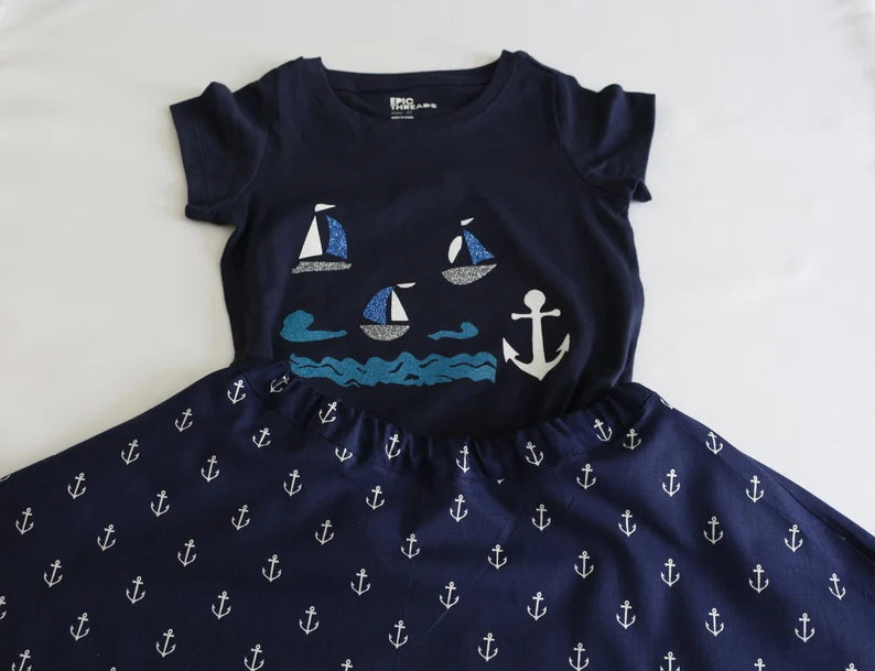Girls Size 4T Toddler Handmade Nautical Boat and Anchor Outfit, Nautical Boats and Anchor Skirt and T-Shirt, Girls Toddler Summer Clothing