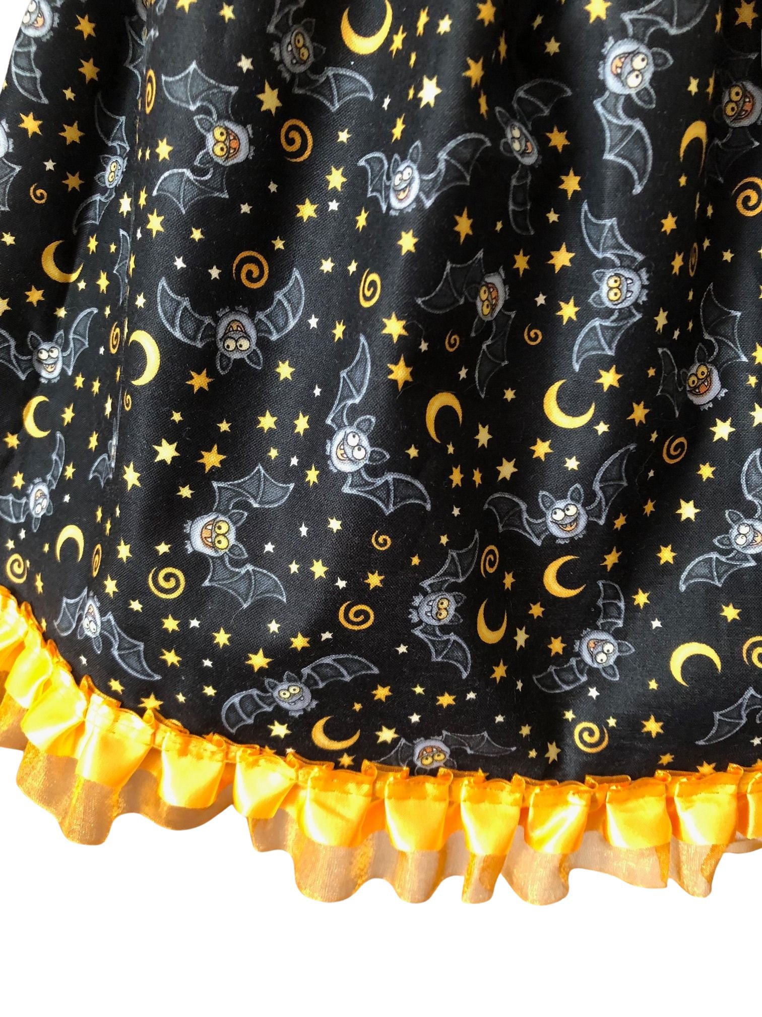 The skirt shows black bats with orange crescent moons and stars. The skirt is handmade with 100% Cotton. The waistband is elastic made with orange satin ribbon. The bottom of the skirt is trimmed with orange ruffled ribbon.