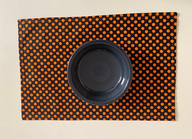 These placemats are a set of 2 matching Reversible placemats. Black Bats enhanced with gold design and golden stars and moon on an orange background are on one side and orange polka dots on black on the other side. Enjoy decorating your Halloween table!