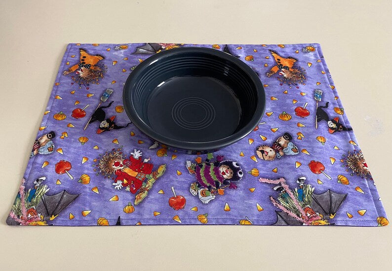Enjoy these playful Trick of Treat Halloween Set of 4 Placemats for celebrating the season at home on your table with your children or decorating for a Halloween party. These placemats are reversible so you can have two different themes. One side has different adoarable animal characters in Halloween costumes on a light purple with tossed candy apples and candy corn. The other side has light tiny purple bats on a dark purple background.