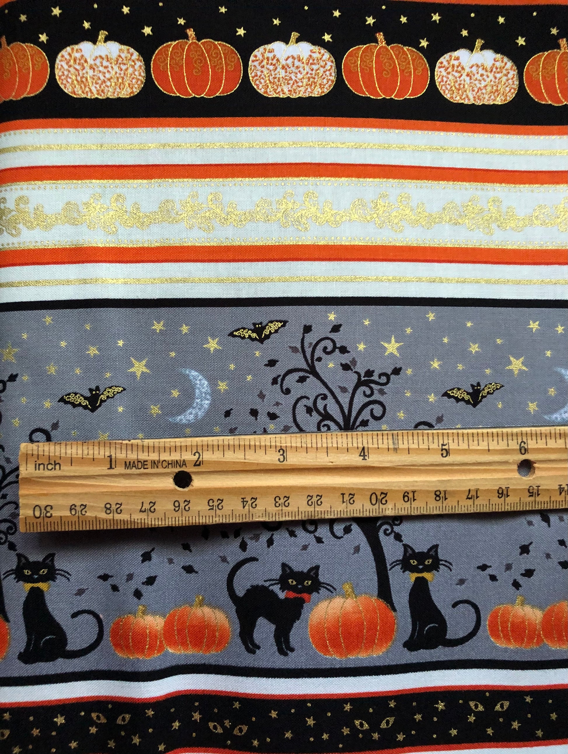 Black cats, bats, trees, pumpkins, crescent moons, stars in a night sky and stripes enhanced with metallic gold.