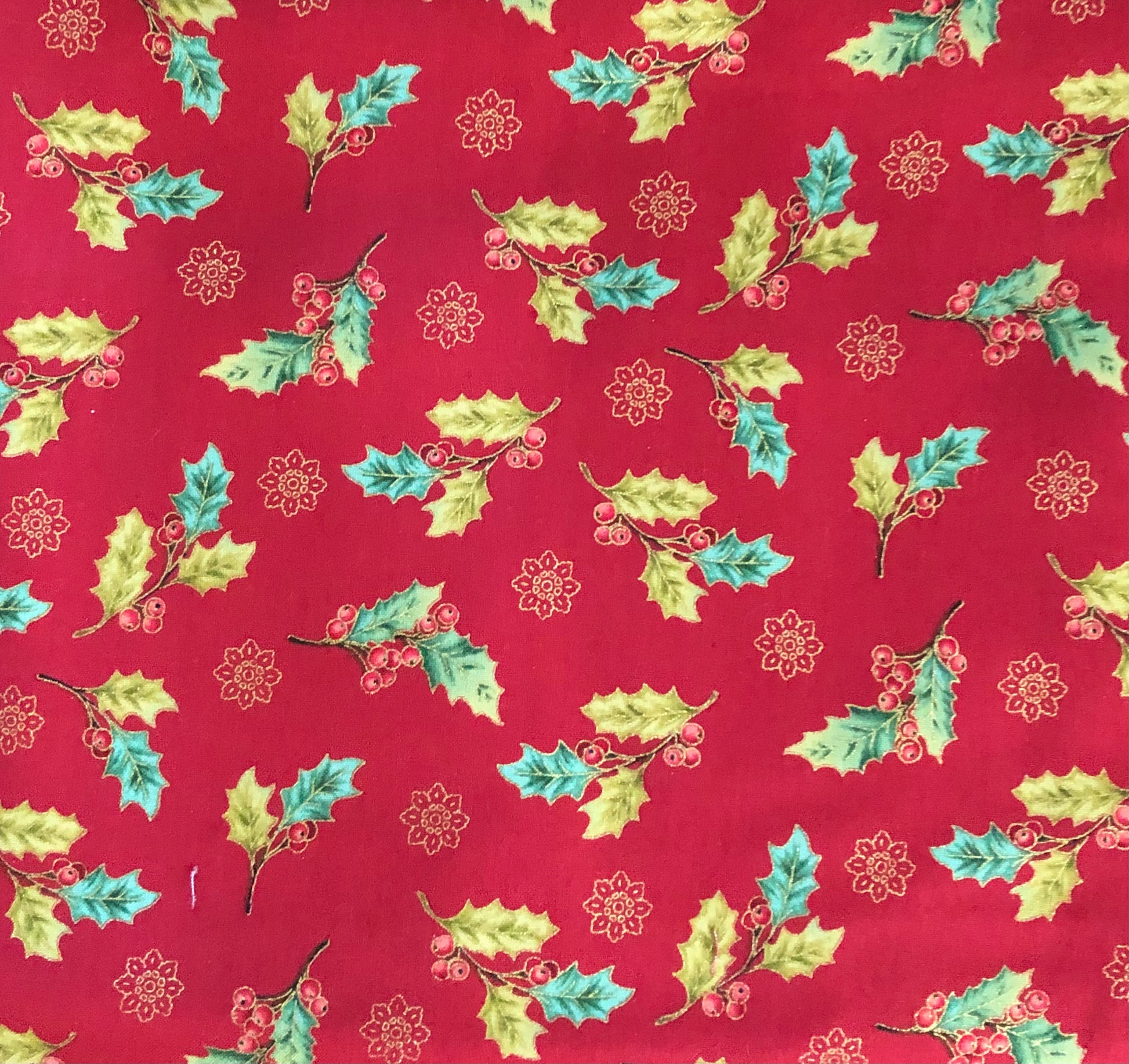 Henry Glass Winter Garden Color Principle Red Holly Berries on Red Metallic Gold, Designer Cotton, Quilting Fabric, Sold by YARD