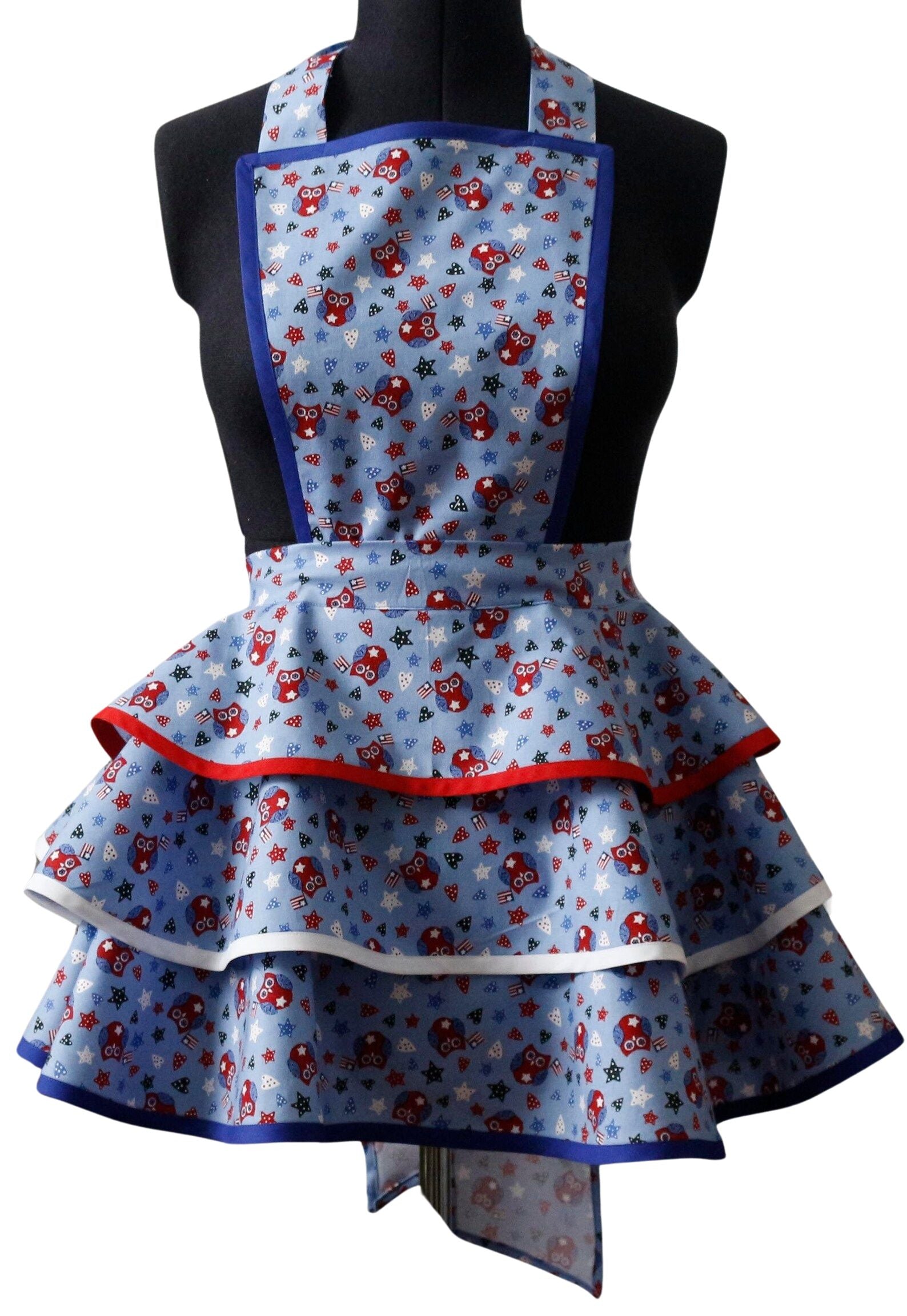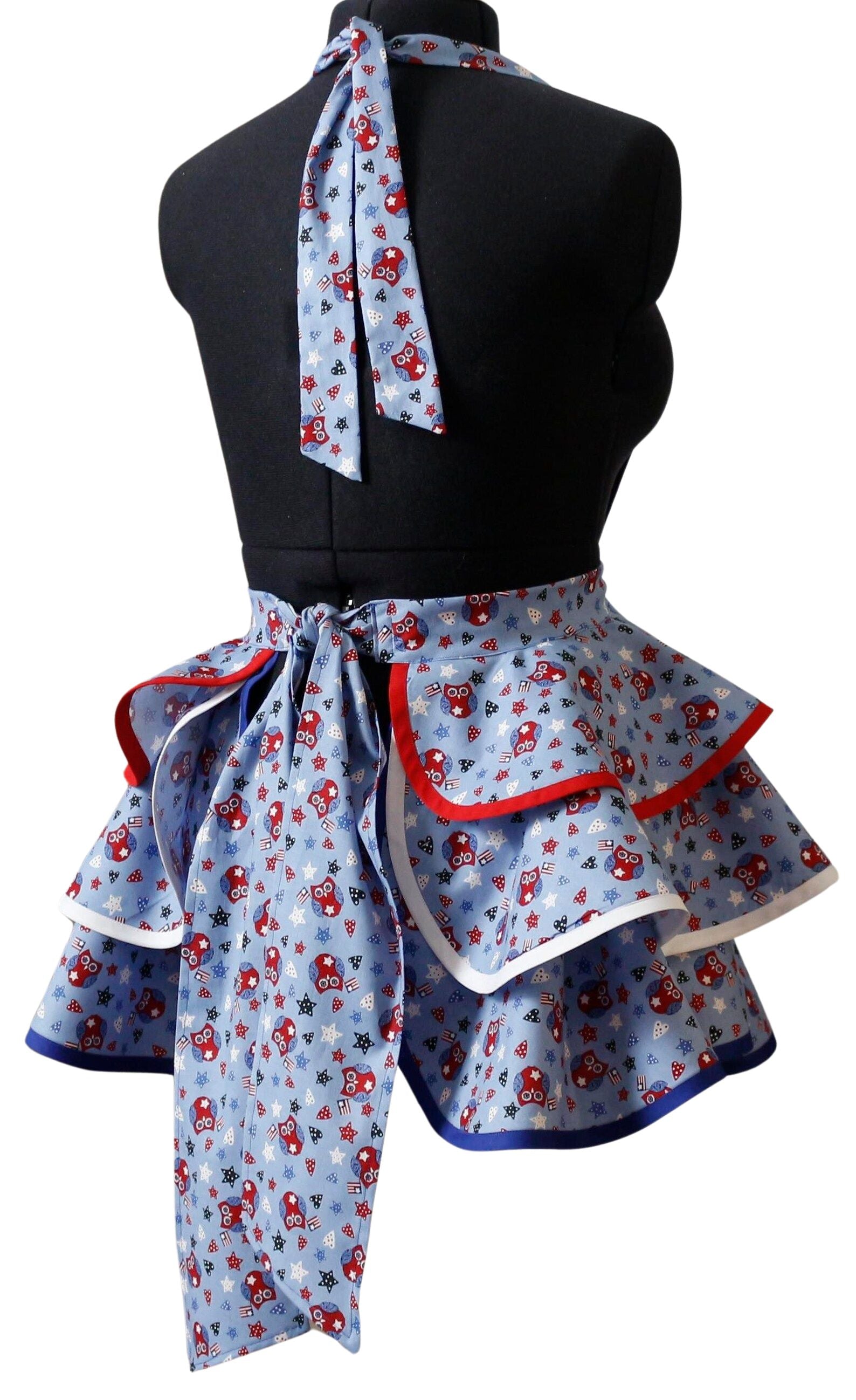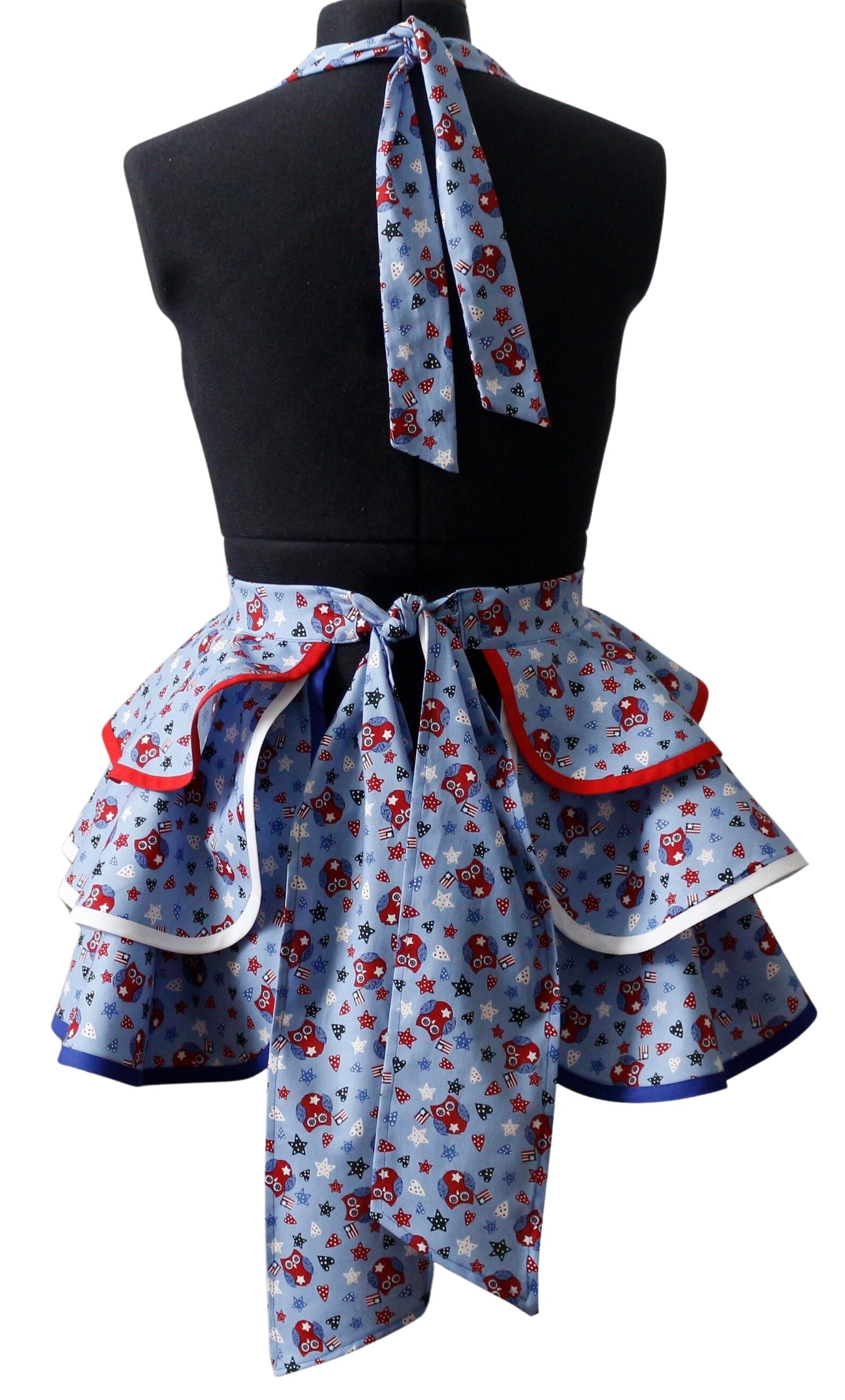 The apron has red and blue owls with American Flags on a light blue background and red, white, and navy blue stars and hearts with tiny polka dots. The waistband, waist and neck ties are the same owl material. The apron top is edged with blue bias tape and the skirt ruffles edged with red, white and blue bias tape. The top of the apron is lined.