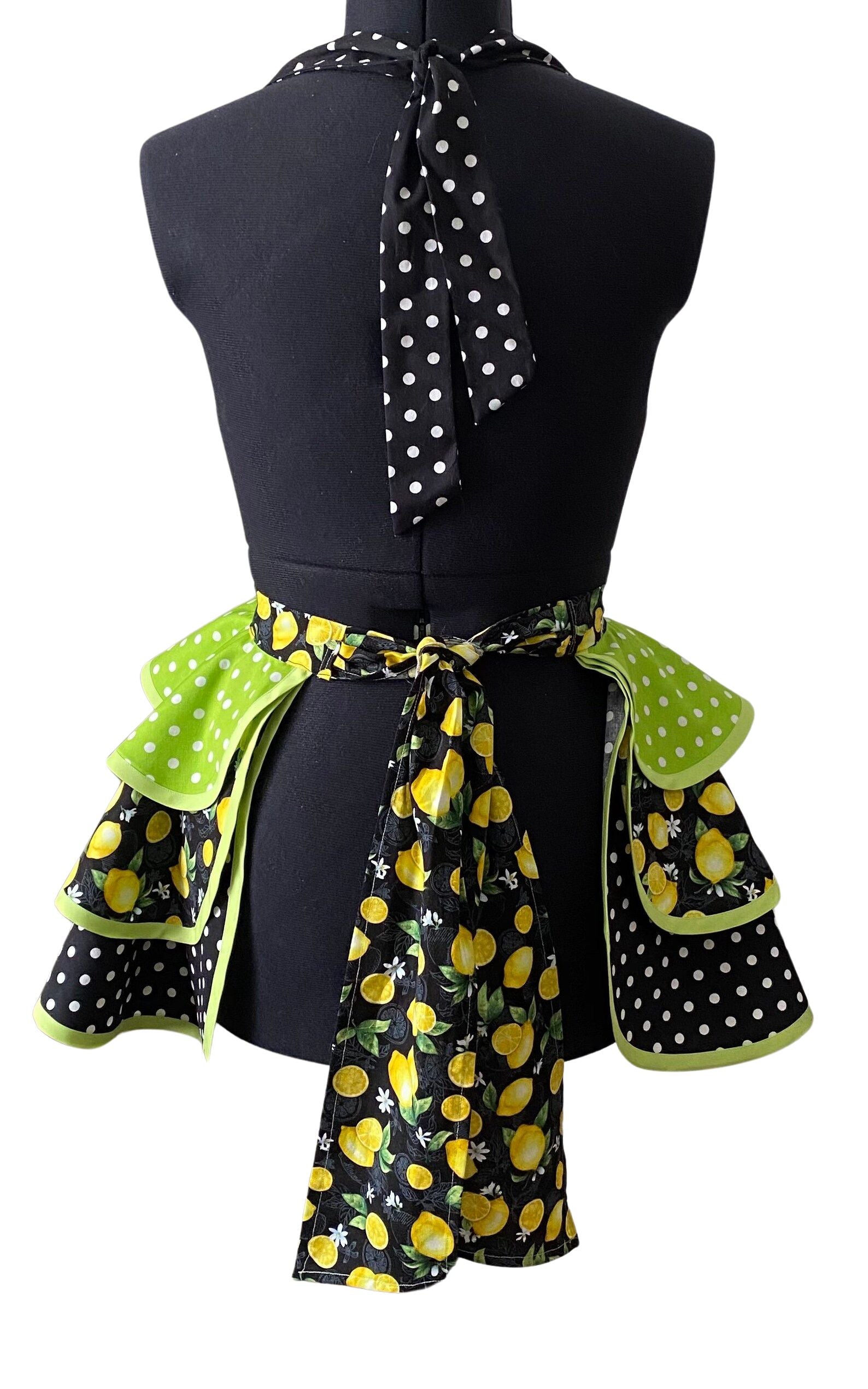 The apron top, waistband, waist ties, and middle skirt ruffle has yellow lemons with green leaves and tiny white flowers on a black background. The neck ties and bottom skirt ruffle are black with white polka dots. The top skirt ruffle is bright lime green with white polka dots. The apron top and bottom skirt ruffles are edged with lime green bias tape. The top of the apron is lined.
