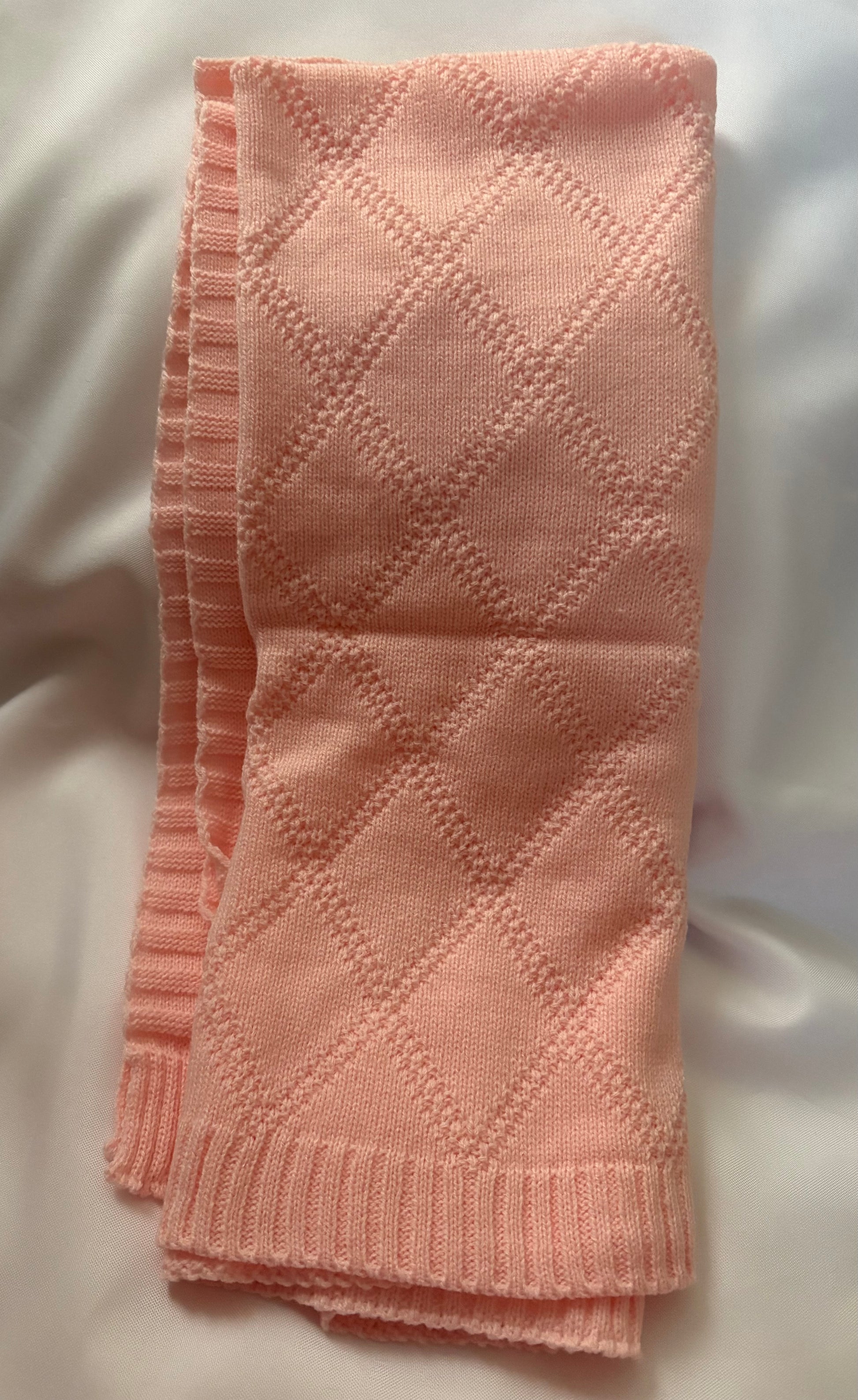Includes peach outfit, white had with a pink bow, a knit peach blanket, and baby bottle.