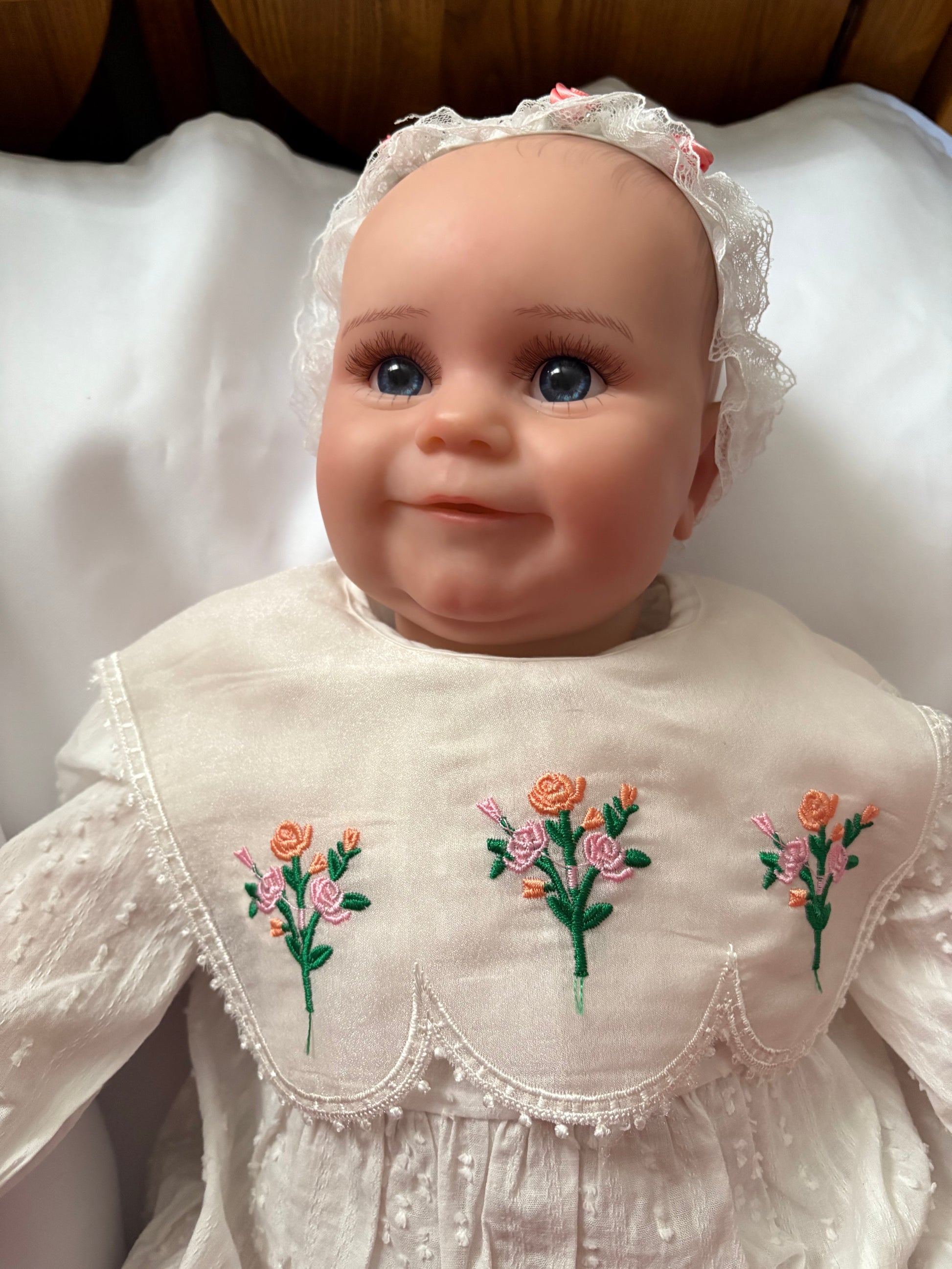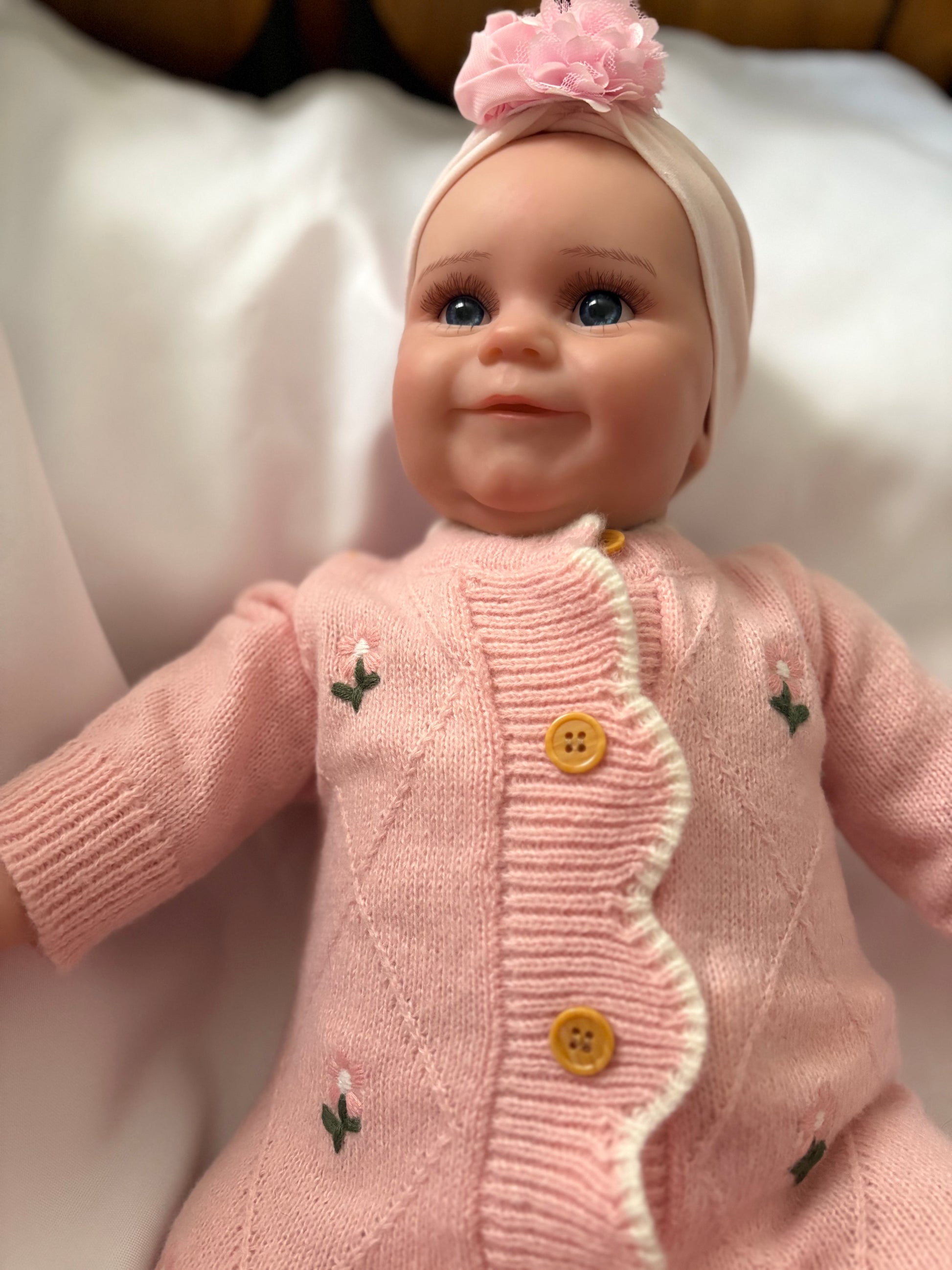 This Adorable Reborn Girl Doll is lifelike and has realistic details including translucent nails, visible veins, hand painted skin and hair, and soft vinyl limbs. Doll is a plump girl that has stuffed SOFT CLOTH Body. She is very cuddly doll and nice to sleep with.