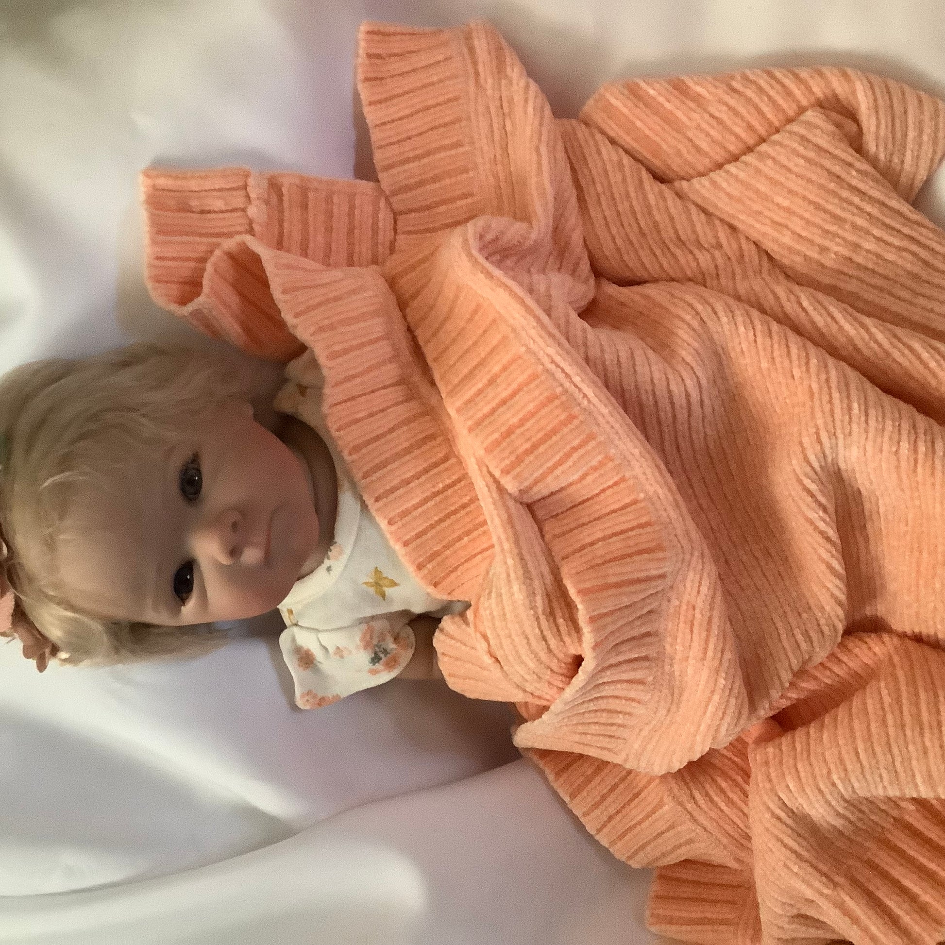 This Adorable Reborn Girl Baby Doll is a lifelike newborn and has realistic details including blonde rooted hair, translucent nails, visible veins, hand painted skin, and soft vinyl limbs. This doll is flexible and allows free movement of the head and limbs.