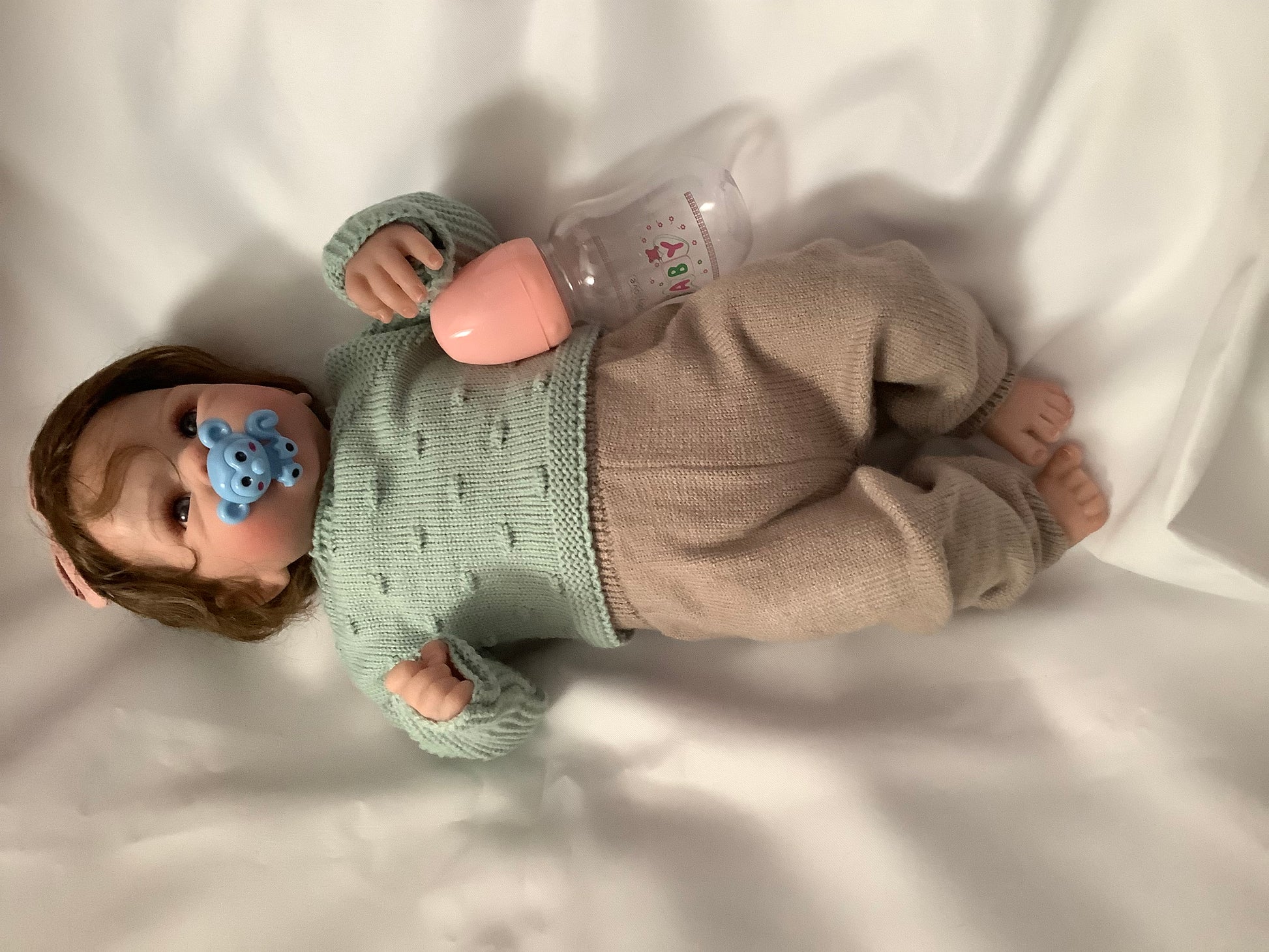 Includes an outfit with a green sweater, beige pants, and headband with bow. Also includes a soft plush purple blanket, bottle, and pacifier.