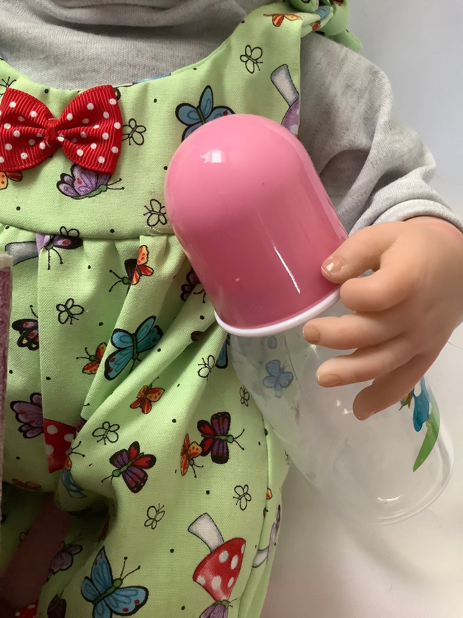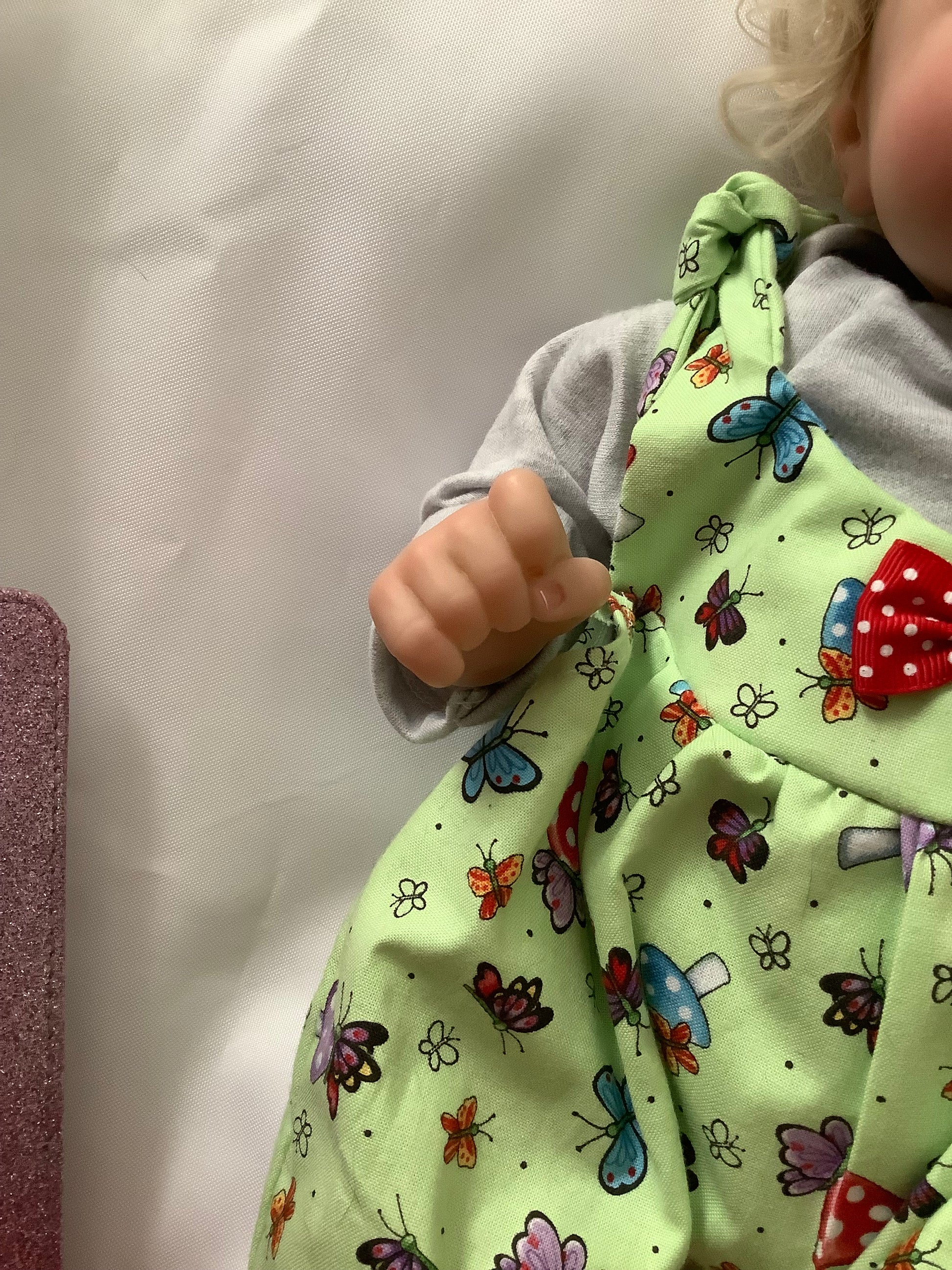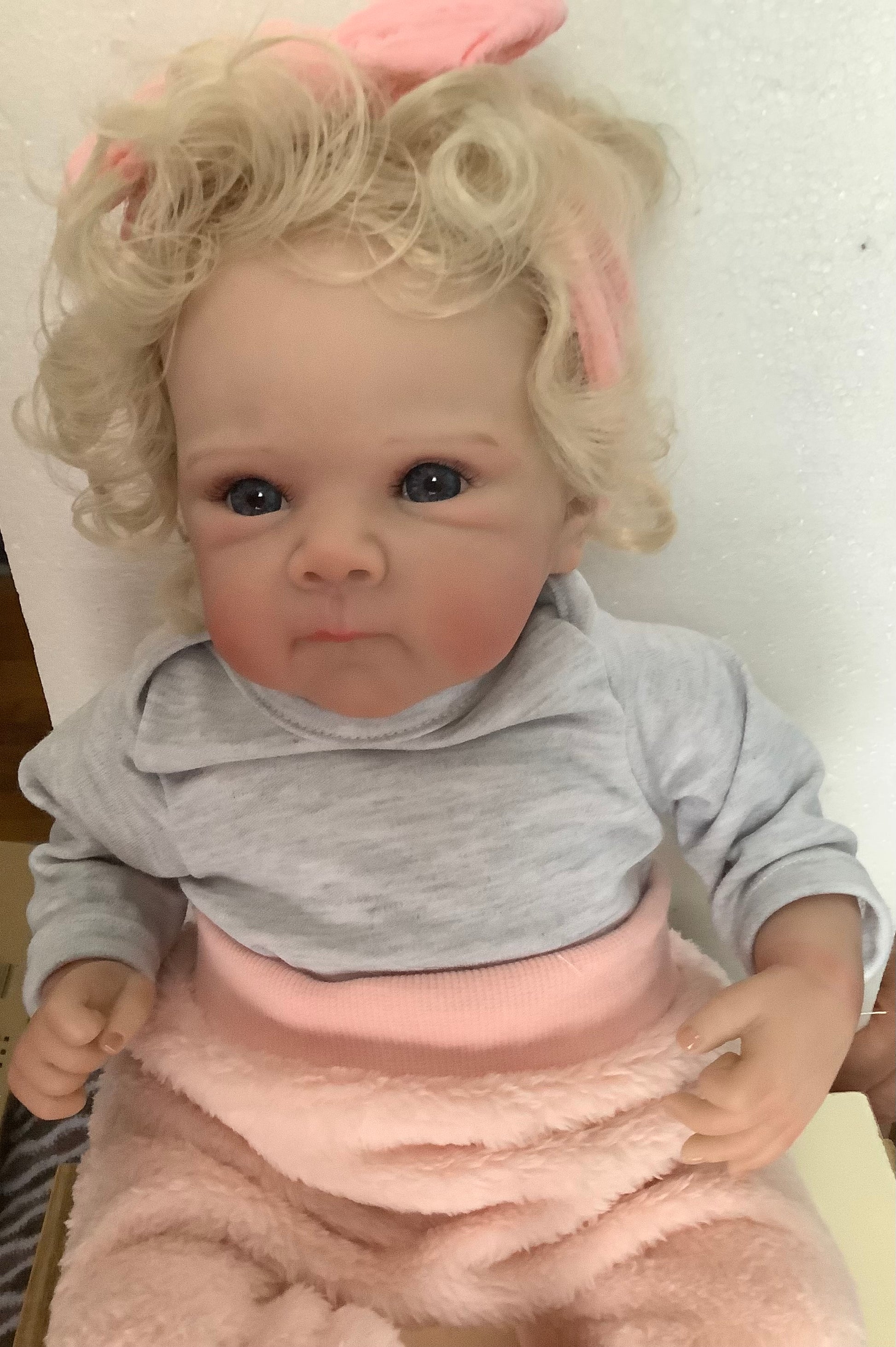 This Adorable Reborn Girl Doll is lifelike and has realistic details including teeth, blonde rooted hair, translucent nails, visible veins, hand painted skin, and soft vinyl limbs.