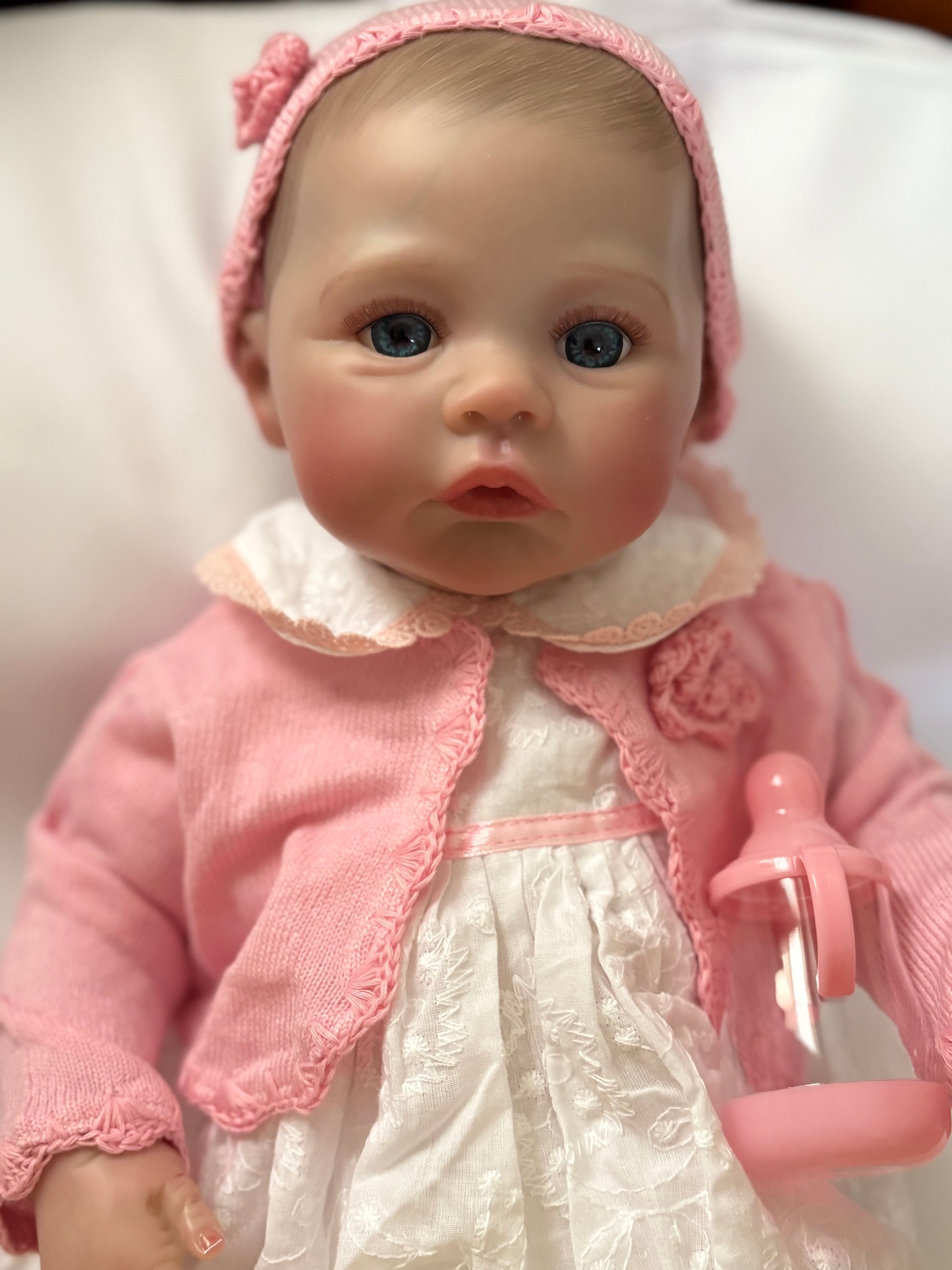 This Adorable Reborn Newborn Girl Doll is lifelike and has realistic details including translucent nails, visible veins, hand painted skin and hair, and soft vinyl limbs. Doll has a SOFT CLOTH BODY.