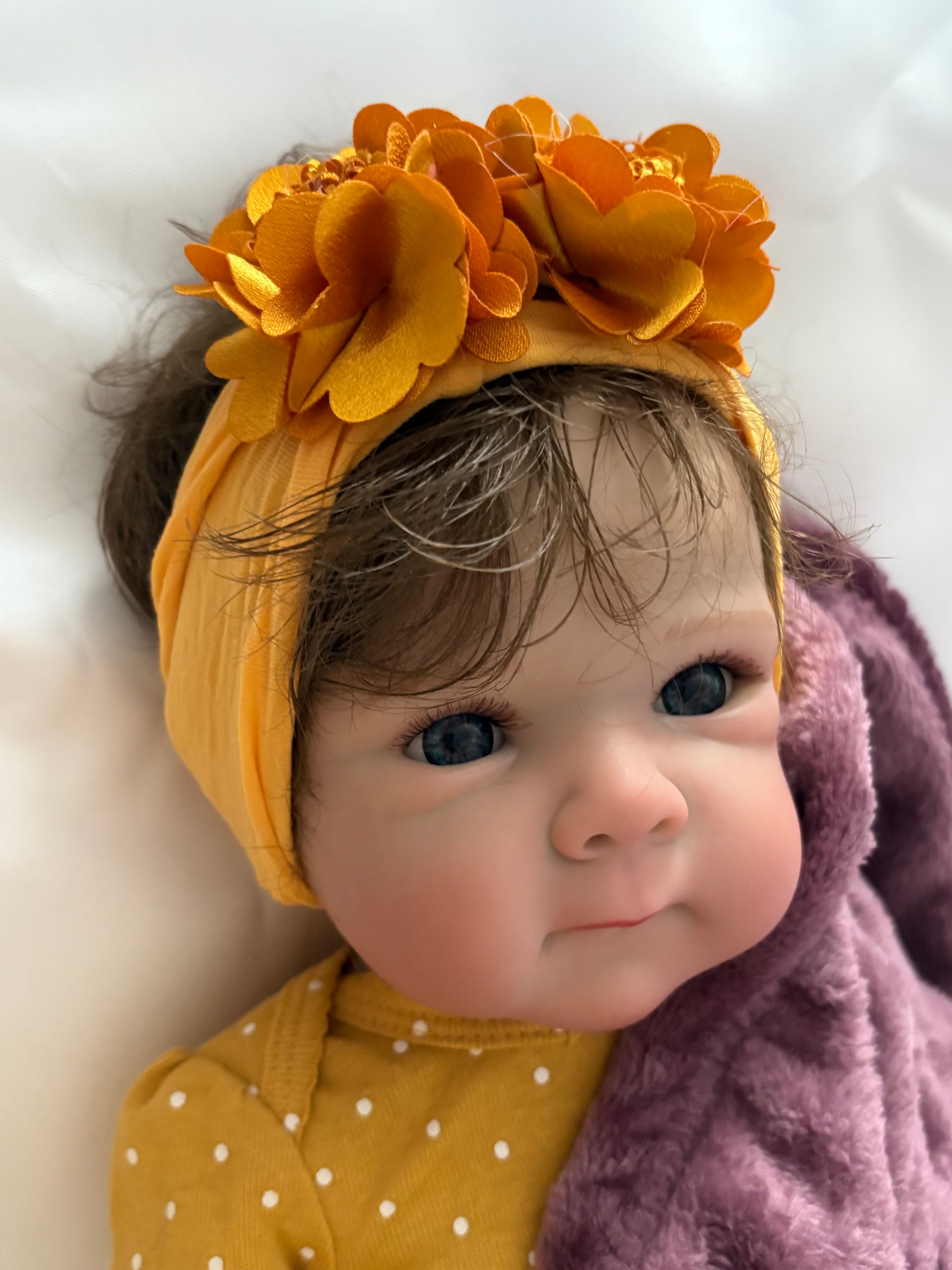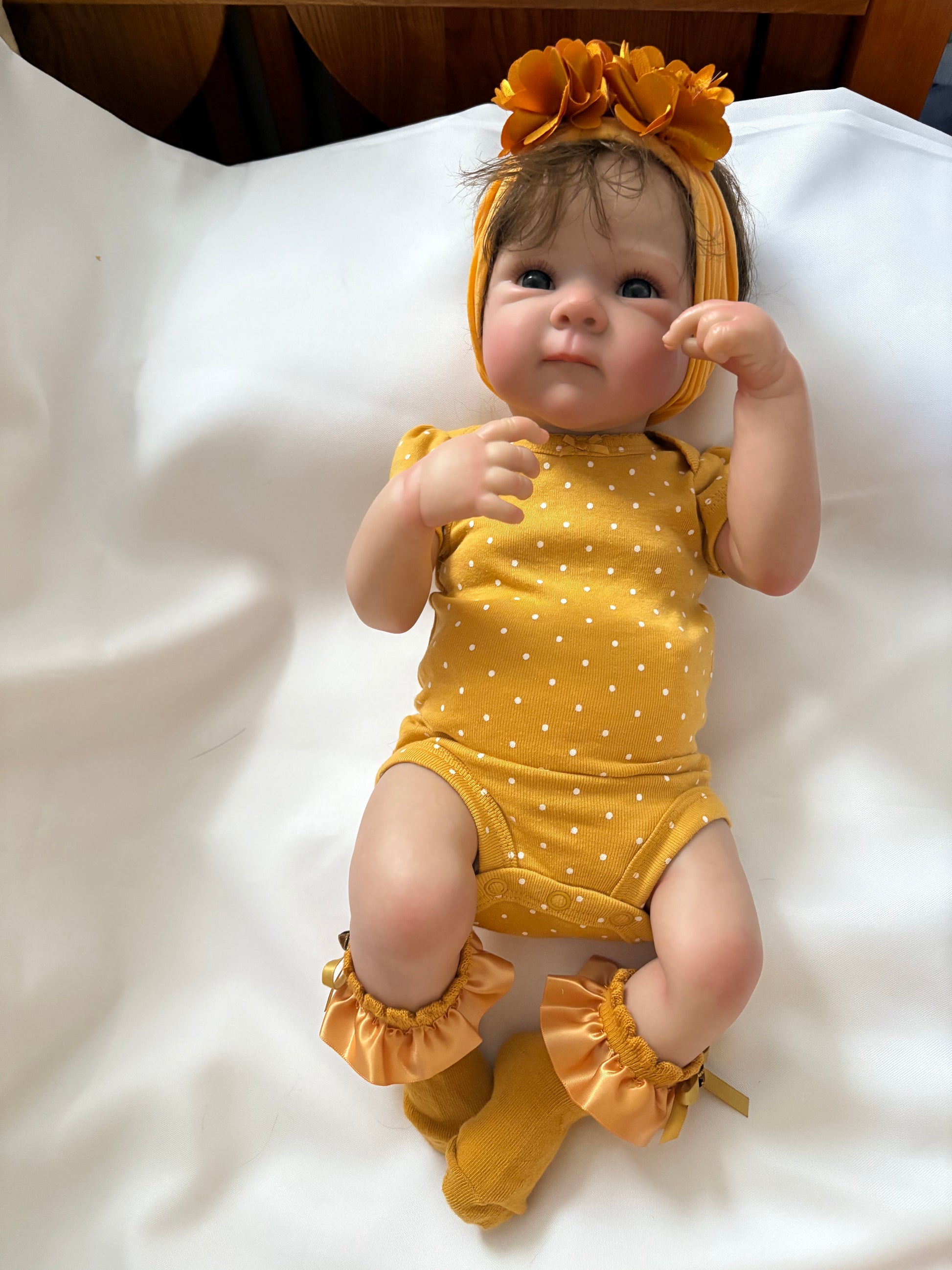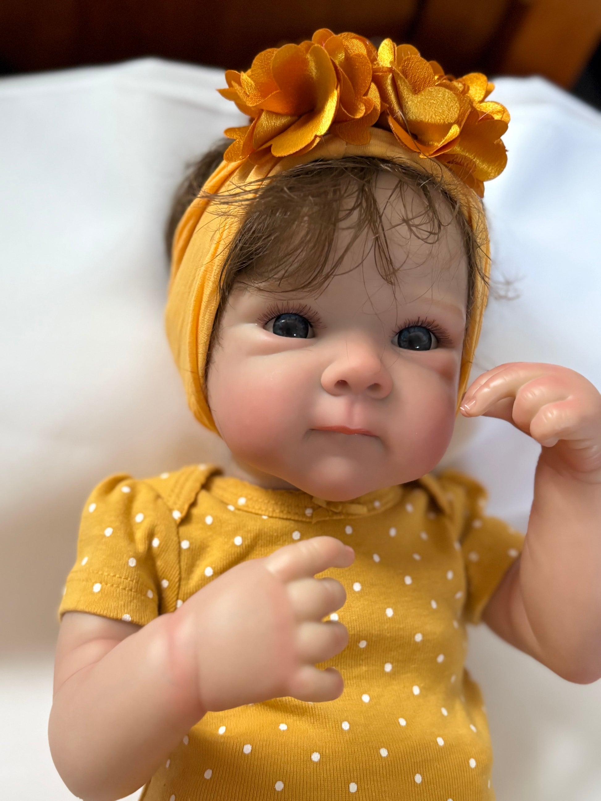 This Adorable Reborn Girl Baby Doll is a lifelike newborn and has realistic details including brown brunette rooted hair, translucent nails, visible veins, hand painted skin, and soft vinyl limbs. This doll is flexible and allows free movement of the head and limbs.