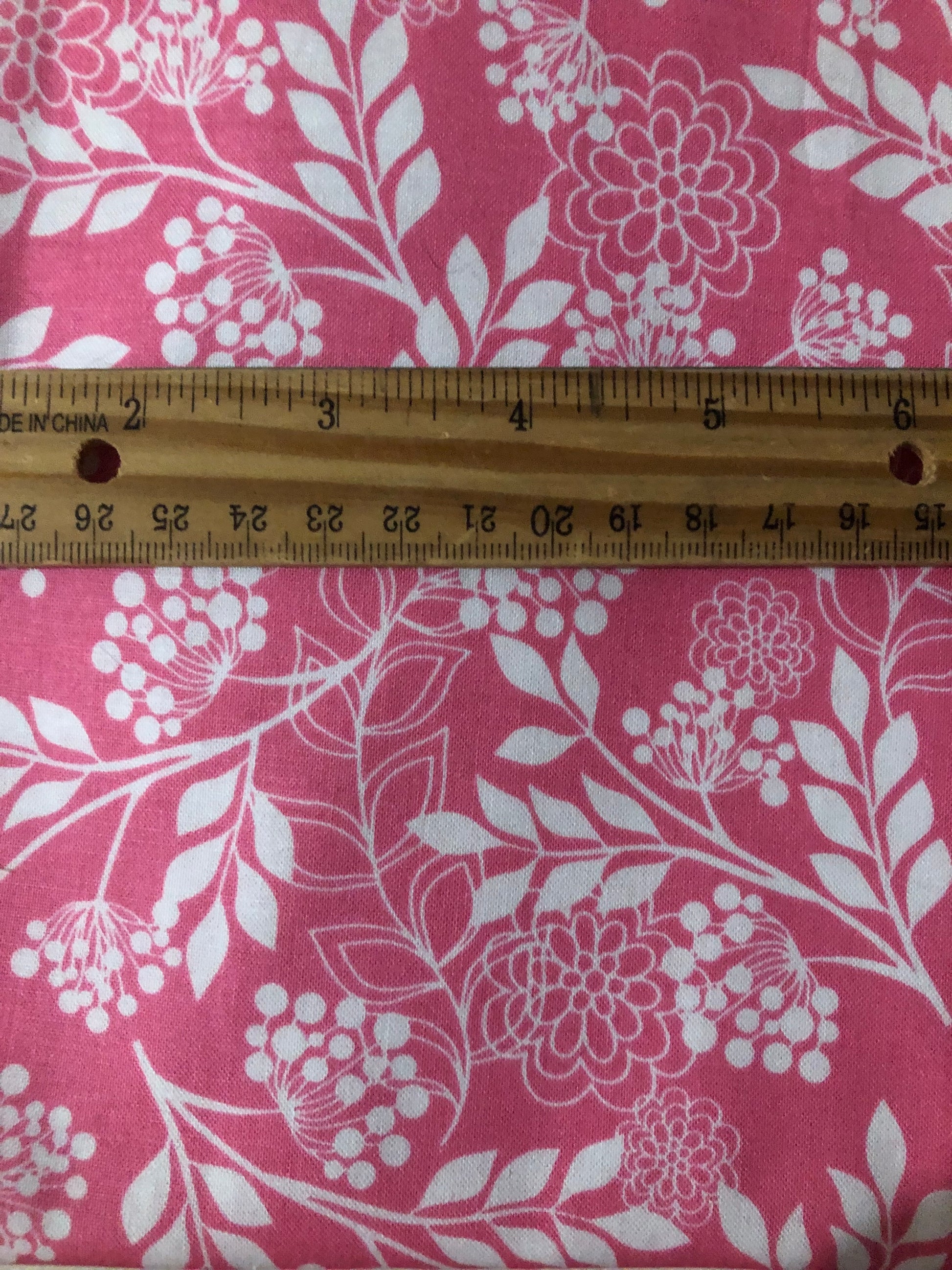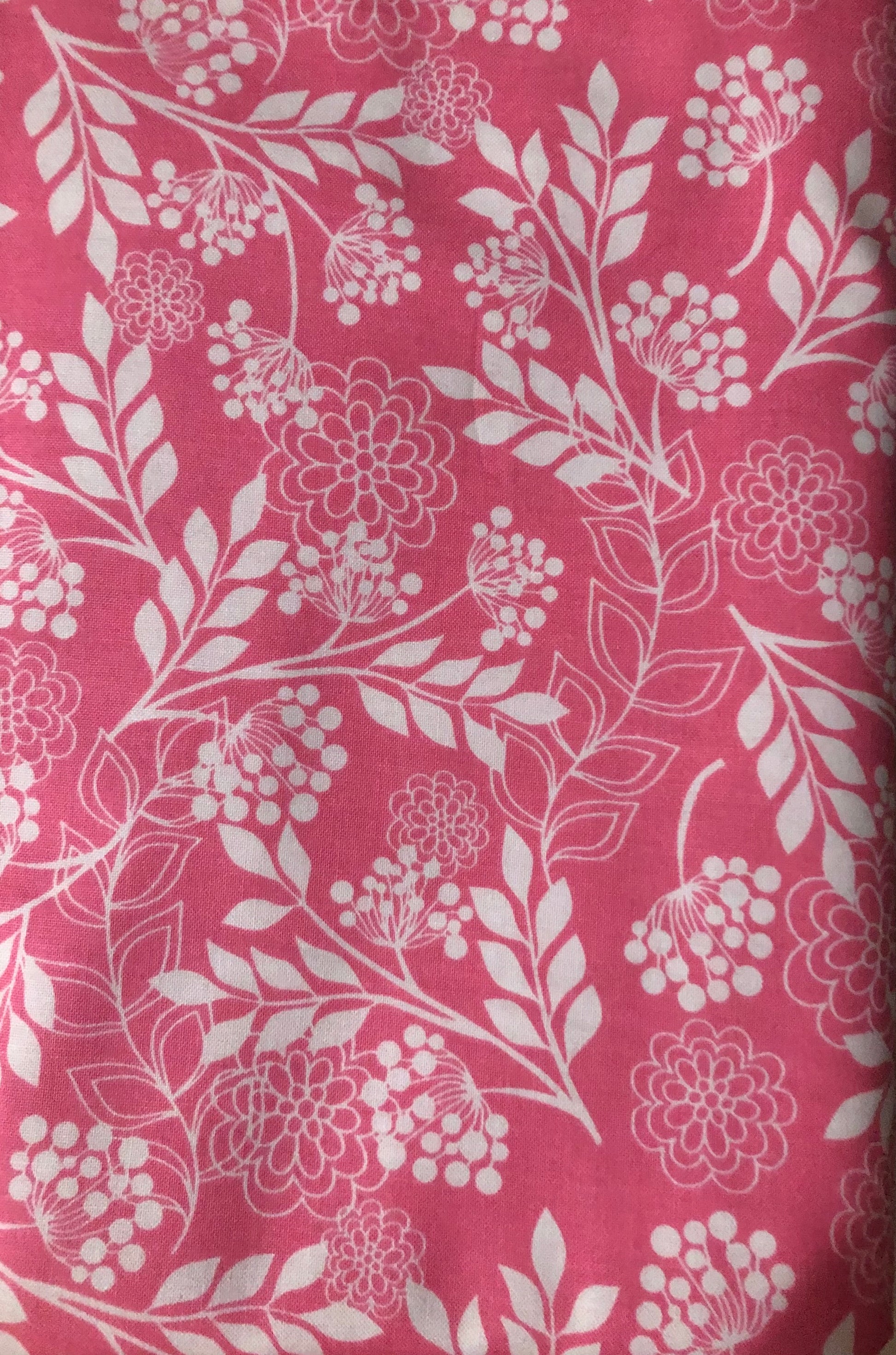 Riley Blake "Fantine" white floral pattern on pink fabric.