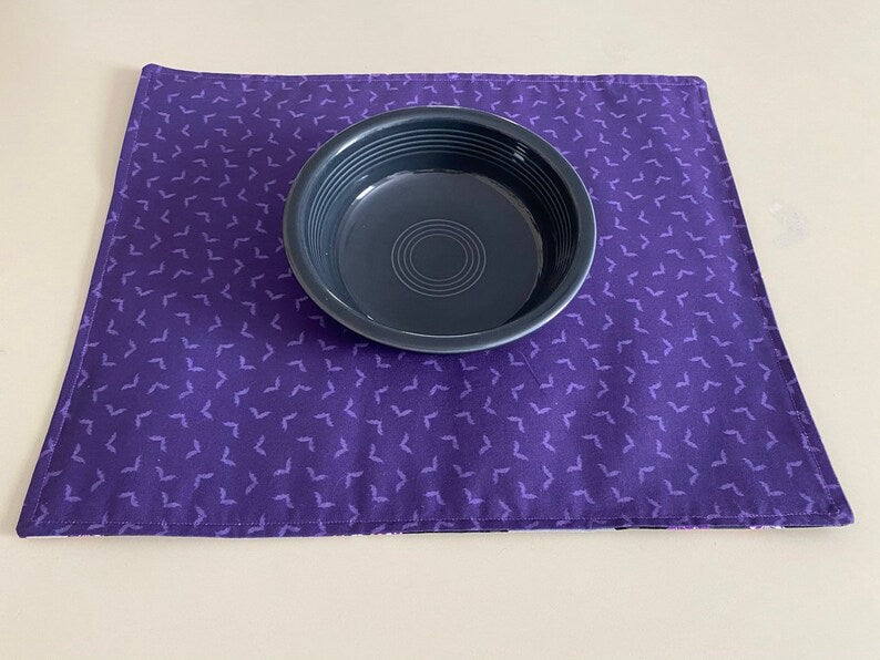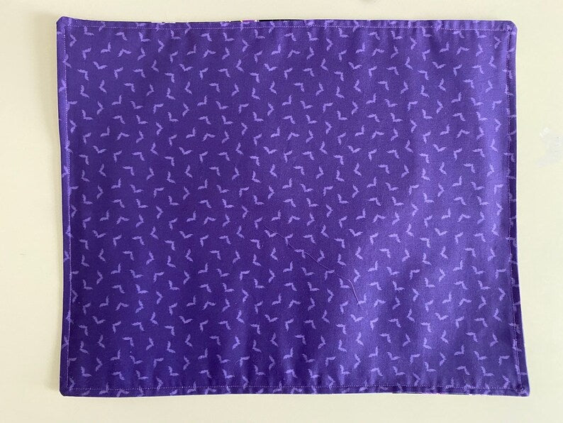Enjoy these elegant, reversible Haunted House Halloween Village Set of 4 Placemats for celebrating the season at home on your table or decorating for a Halloween party. These placemats are reversible so you can have two different themes. One side has haunted houses in a village scene on black with grey trees. The other side has tiny light purple bats on a dark purple background.