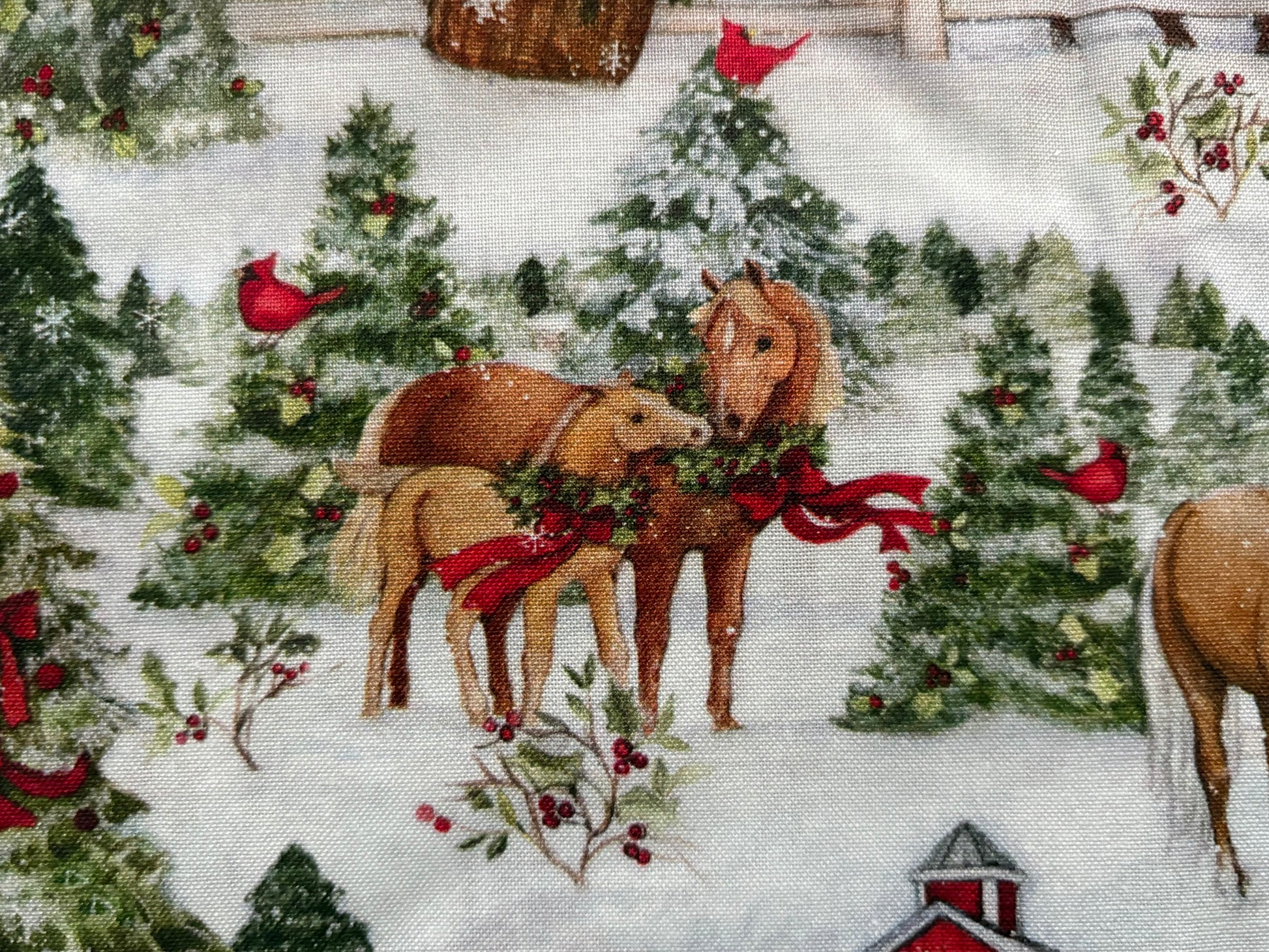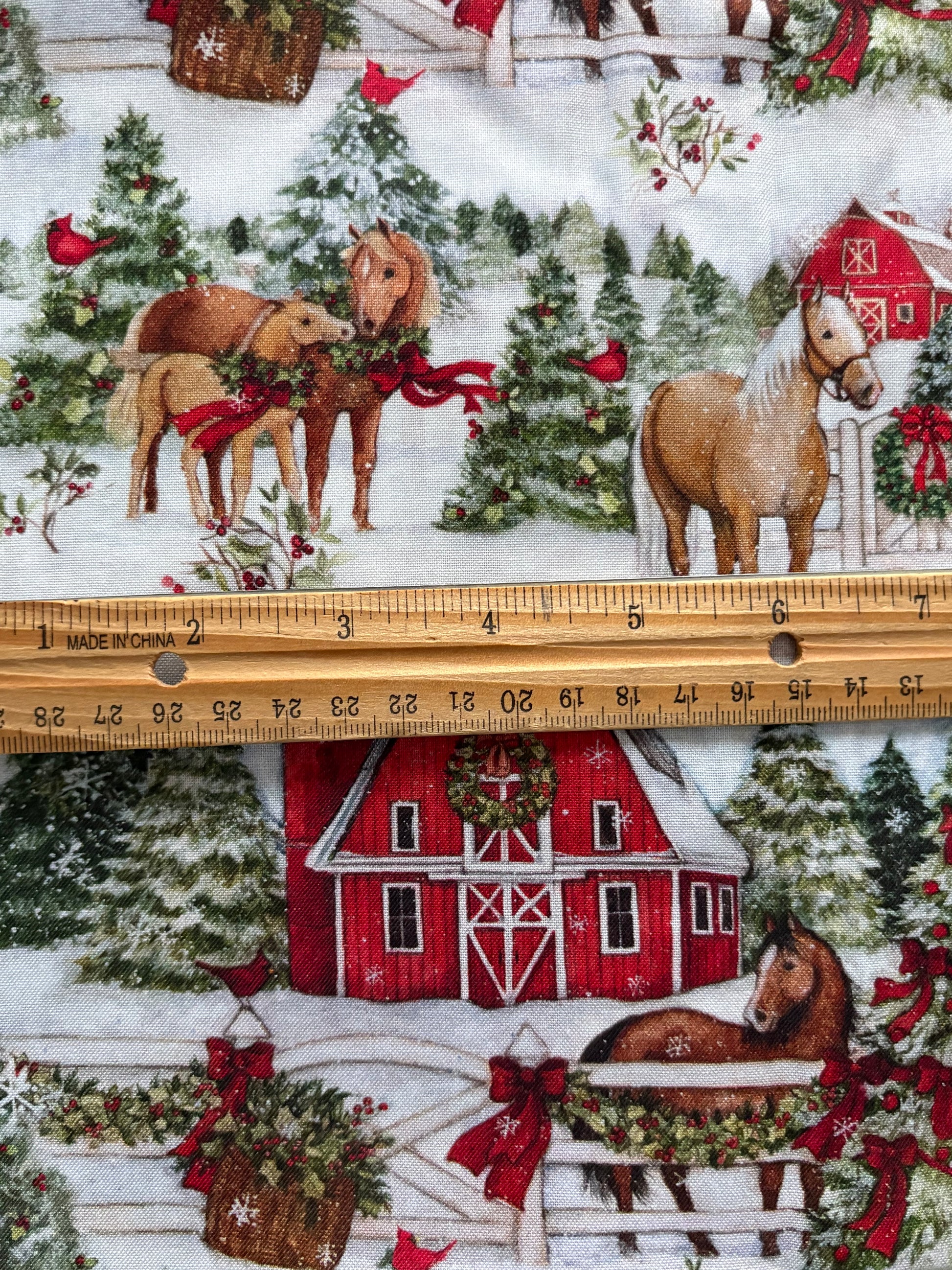 Susan Winget Christmas Winter Barn and Horses, Designer Cotton, Quilting Fabric, Sold by YARD